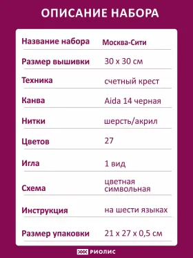 В набор входит: цветная схема, канва для вышивания без нанесенного рисунка Zweigart Aida 14 черная, нитки шерсть/акрил (27 цветов) на плашке(ах), игла. Размер готовой работы: 30х30 см. В наборе используются техники: крест, полукрест, смешанные цвета. В набор для вышивания Риолис 2075 Москва-Сити входит все необходимое для творческого процесса. Мы комплектуем наборы с запасом ниток в 20% от необходимого количества каждого цвета. Благодаря нашим наборам творчество доступно каждому! Просто выберите дизайн по душе и становитесь его создателем.
