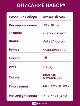 В состав комплекта «Розовый сон», входит канва белая без нанесённого рисунка 14 каунта, нитки на плашках мулине 18 оттенков, а также простая для понимания цветная символьная схема и качественная игла. Габариты готовой работы 30х30 см. Используется техника счетный крест, полукрест, стежок, смешанные цвета. Прилагается игла для вышивания крестиком нужного размера, чтобы обеспечить легкость и точность шитья. Благодаря подробной схеме и приложенной инструкции работа с картиной будет лёгкой и приятной! Набор подходит для праздничных поводов, таких как День рождения, Рождество, Новый год. Оформленная картина послужит прекрасным презентом для мамы или бабушки. Продукция бренда Риолис - оптимальное решение для тех, кто ищет изделие высокого качества, любит творчество и хочет попробовать себя. В нашем ассортименте найдутся варианты на любой вкус, как для опытных искусниц, так и для начинающих вышивальщиц, для детей и взрослых. От маленьких уникальных сюжетов до больших картин и репродукций. Риолис - ваш идеальный выбор!