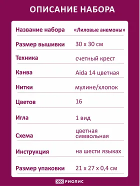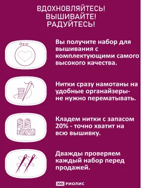 В состав комплекта входит канва серая без нанесённого рисунка 14 каунта, нитки мулине на плашках 16 оттенков, а также простая для понимания цветная символьная схема и качественная игла. Габариты готовой работы 30х30 см. Используется техника счетный крест, полукрест, стежок. Прилагается игла для вышивания крестиком нужного размера, чтобы обеспечить легкость и точность шитья. Благодаря подробной схеме и приложенной инструкции работа с картиной будет лёгкой и приятной! Набор подходит для праздничных поводов, таких как День рождения, Рождество, Новый год. Оформленная картина послужит прекрасным презентом для мамы или бабушки. Продукция бренда Риолис - оптимальное решение для тех, кто ищет изделие высокого качества, любит творчество и хочет попробовать себя. В нашем ассортименте найдутся варианты на любой вкус, как для опытных искусниц, так и для начинающих вышивальщиц, для детей и взрослых. От маленьких уникальных сюжетов до больших картин и репродукций. Риолис - ваш идеальный выбор!