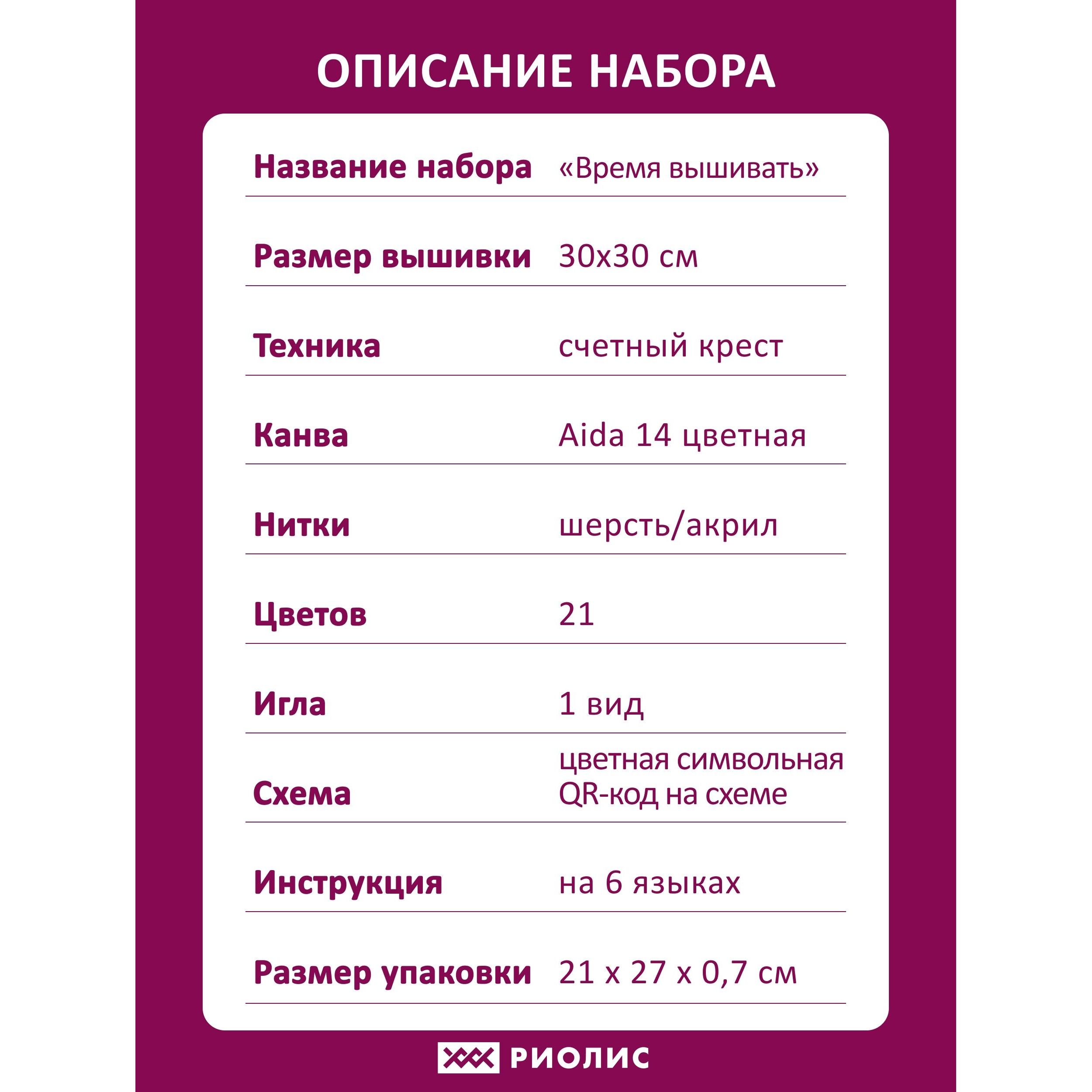 Вышивка крестиком набор от Риолис Время вышивать 30х30 см - это превосходный выбор для тех, кто ценит творчество, рукоделие и хобби. Набор для вышивания отлично подходит как для начинающих, так и для опытных вышивальщиц. Вышивка крестом своими руками - увлекательное занятие и прекрасный способ расслабиться и отдохнуть.