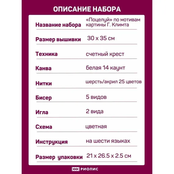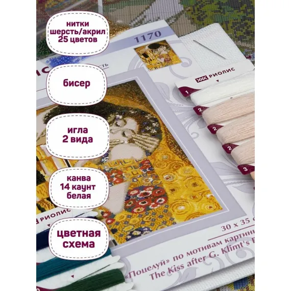 В наборе для вышивания крестом по мотивам картины Г. Климта "Поцелуй" используются техники: счётный крест, вышивка бисером. В наборы Риолис входит все необходимое для творческого процесса. Мы комплектуем наборы с запасом ниток в 20% от необходимого количества каждого цвета. Благодаря нашим наборам для вышивки творчество доступно каждому! Просто выберите дизайн по душе и становитесь его создателем. Размер готовой работы: 30х35 см Комплектация: канва для вышивания без нанесённого рисунка 14 белая, нитки шерсть/акрил 25 цветов на плашке(ах), понятная цветная символьная схема для вышивки крестиком, бисер (4 вида), стеклярус (1 вид), игла для вышивания, игла для бисера.