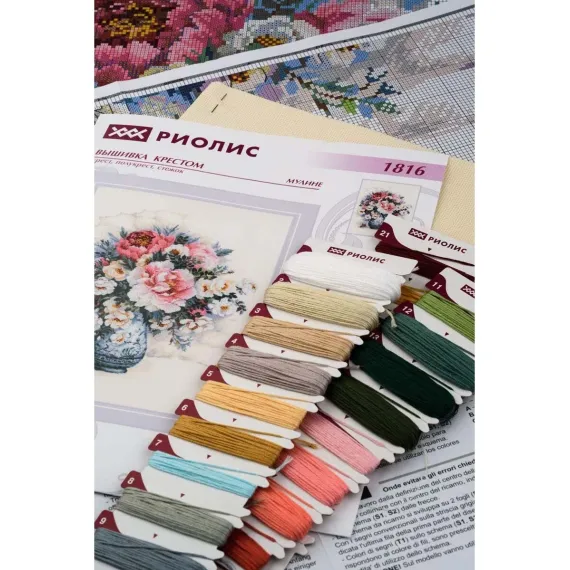 Чтобы вышивать крестиком, не потребуются особые навыки – достаточно проявить терпение, усидчивость и аккуратность. В наборе для вышивки крестом 'Пионы и шиповник' используется хлопковое мулине – эти нитки яркие, равномерные по всей длине, без узелков и утолщений, что позволяет добиться аккуратных стежков. Канва Aida 18 каунта позволяет вышивать небольшими стежками и прекрасно подходит для схем с подробной детализацией. Следуйте инструкции, выкладывайте равномерные стежки, и постепенно из-под вашей иглы начнет 'проступать' картина со сложной гаммой, плавными цветовыми переходами.