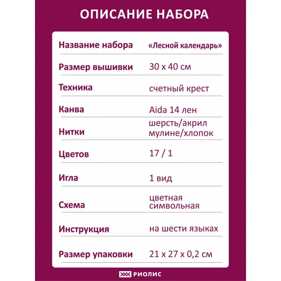 Riolis Набор для вышивания крестом 30х40см 1979 Лесной календарь