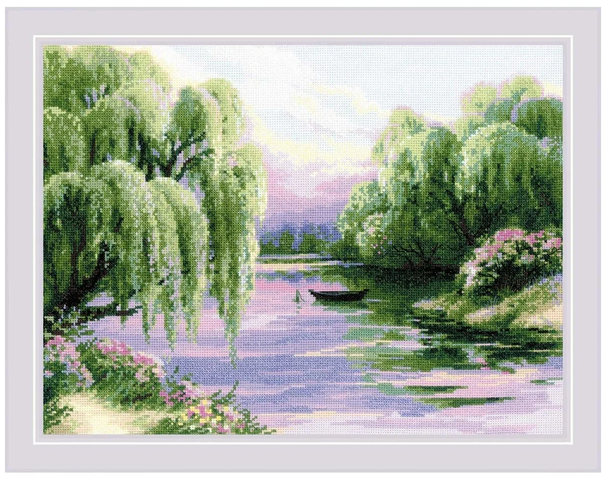 В набор входит: цветная схема, канва Aida 14 белая, нитки мулине Anchor (21 цвет) на плашках, игла. Размер готовой работы: 40х30см. Используются техники: крест, полукрест, стежок, смешанные цвета. В наборы для вышивания крестом РИОЛИС входит все необходимое для творческого процесса. Мы комплектуем наборы для рукоделия нитками с запасом в 20% от нужного количества каждого цвета. Благодаря нашим наборам для вышивки творчество доступно каждому! Просто выберите дизайн по душе и становитесь его создателем. Ивы, склонившиеся над прудом, прекрасный сад с розовыми цветами, отражение голубо-розового неба в воде, лодочка - сюжет умиротворяет, погружает вас в тихую утренюю атмосферу уединения.