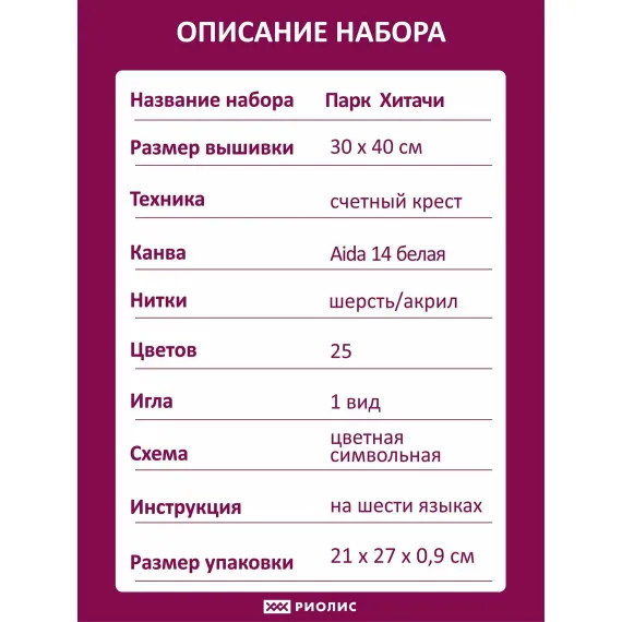 В наборе для вышивания крестом "Парк Хитачи" используются техники: счётный крест, стежок, смешанные цвета. В наборы Риолис входит все необходимое для творческого процесса. Мы комплектуем наборы с запасом ниток в 20% от необходимого количества каждого цвета. Благодаря нашим наборам творчество доступно каждому! Просто выберите дизайн по душе и становитесь его создателем. Размер готовой работы: 30х40 см. В набор входит: цветная символьная схема, канва для вышивания без нанесенного рисунка 14 белая, нитки шерсть/акрил (25 цветов) на плашке(ах), игла, инструкция.