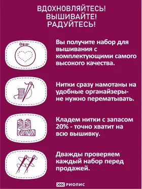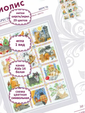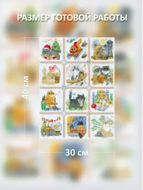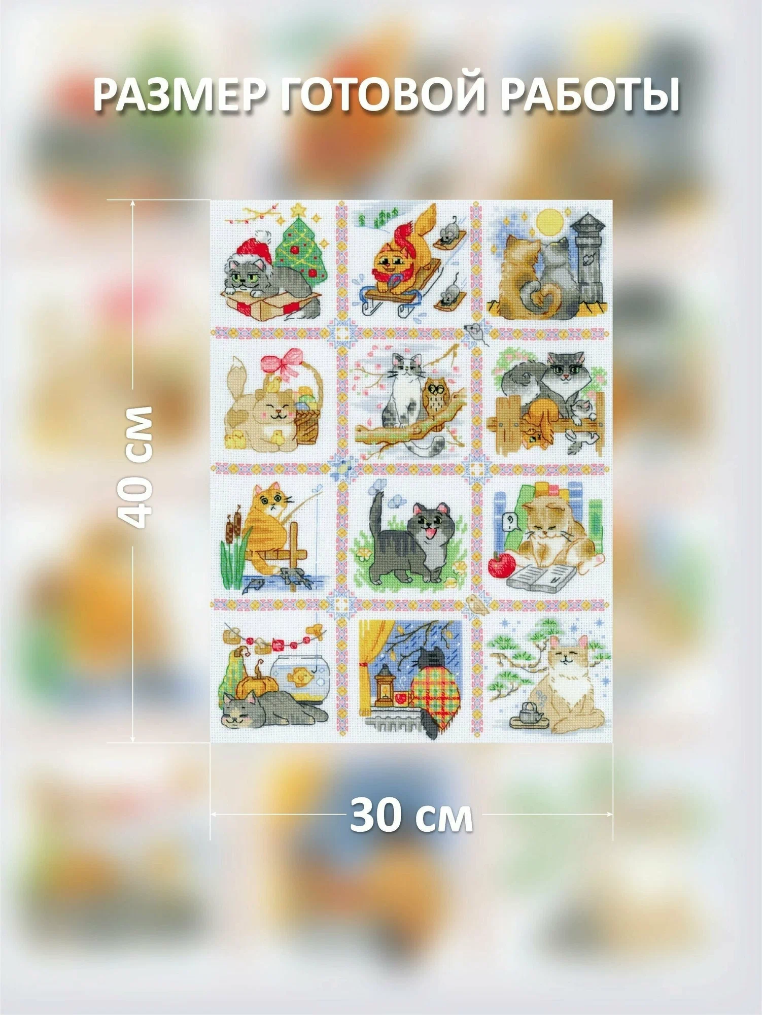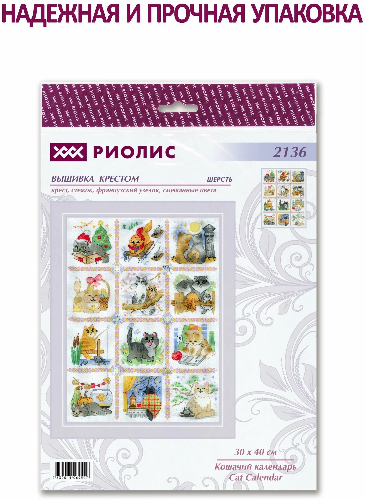 В наборе для вышивания крестом "Кошачий календарь" используются техники: счётный крест, стежок, французский узелок, смешанные цвета. В наборы Риолис входит все необходимое для творческого процесса. Мы комплектуем наборы с запасом ниток в 20% от необходимого количества каждого цвета. Благодаря нашим наборам творчество доступно каждому! Просто выберите дизайн по душе и становитесь его создателем. Размер готовой работы: 30х40 см. В набор входит: цветная символьная схема, канва для вышивания без нанесенного рисунка Aida 14 белая, нитки шерсть/акрил (29 цветов) на плашке(ах), игла, инструкция