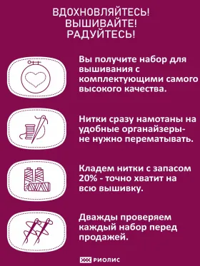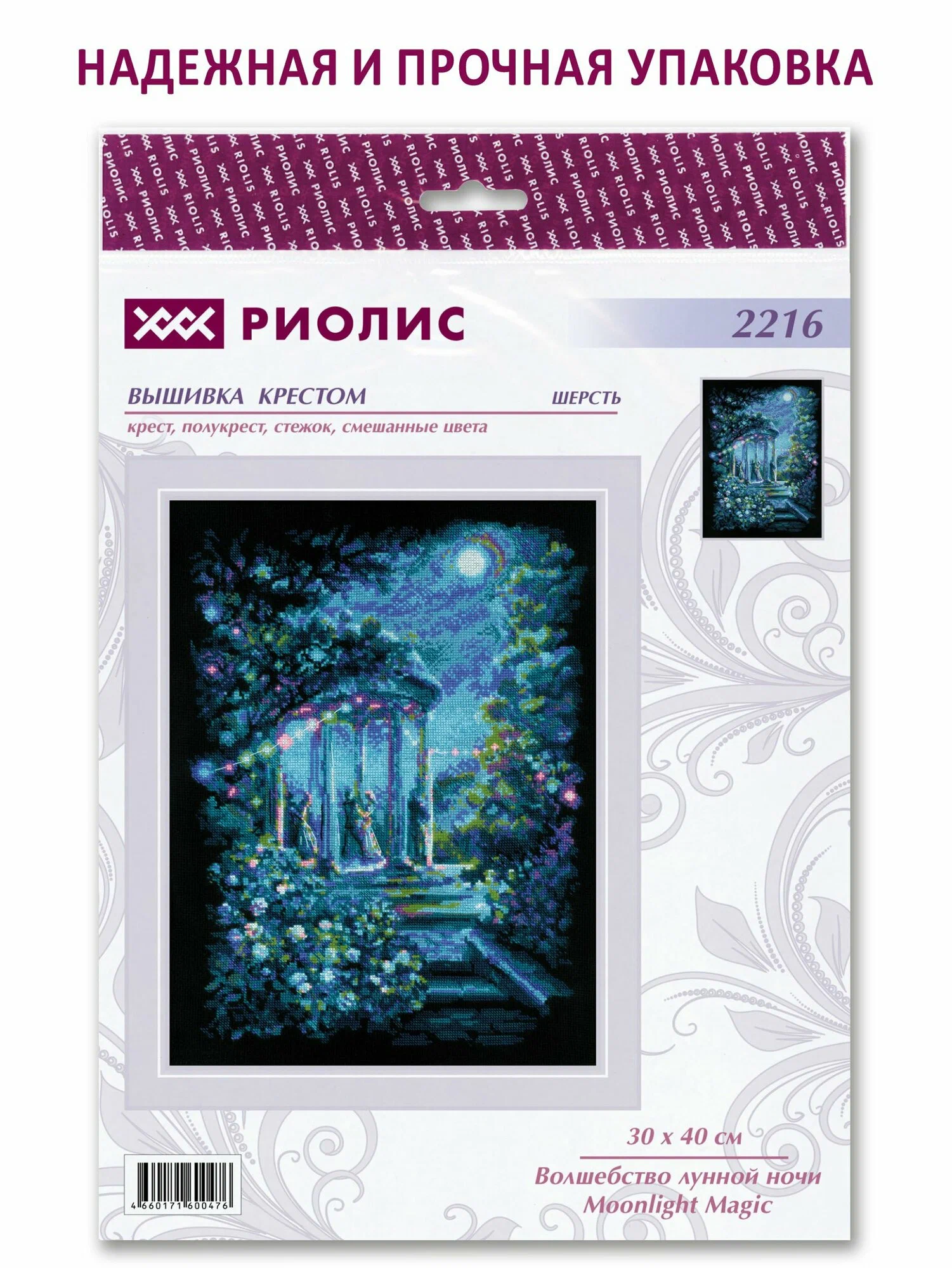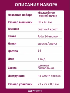 Набор для вышивания крестом "Волшебство лунной ночи" укомплектован: · Канва чёрная, без рисунка Аida 14 каунта · Мулине шерсть (30% шерсть / 70% акрил) · Размер готовой работы 30 х 40 см · Количество цветов - 14 оттенков · Игла для вышивания · Цветная символьная схема · Электронная схема для мобильных приложений Cross stych saga (SAGA) · Подробная инструкция Вышивка выполняется в технике крест, полукрест, стежок, смешанные цвета. Продукция бренда Риолис - оптимальное решение для тех, кто ищет изделие высокого качества, любит творчество и хочет попробовать себя. Благодаря нашим наборам творчество доступно каждому! Просто выберите дизайн по душе и становитесь его создателем. От маленьких уникальных сюжетов до больших картин и репродукций. Риолис - ваш идеальный выбор!