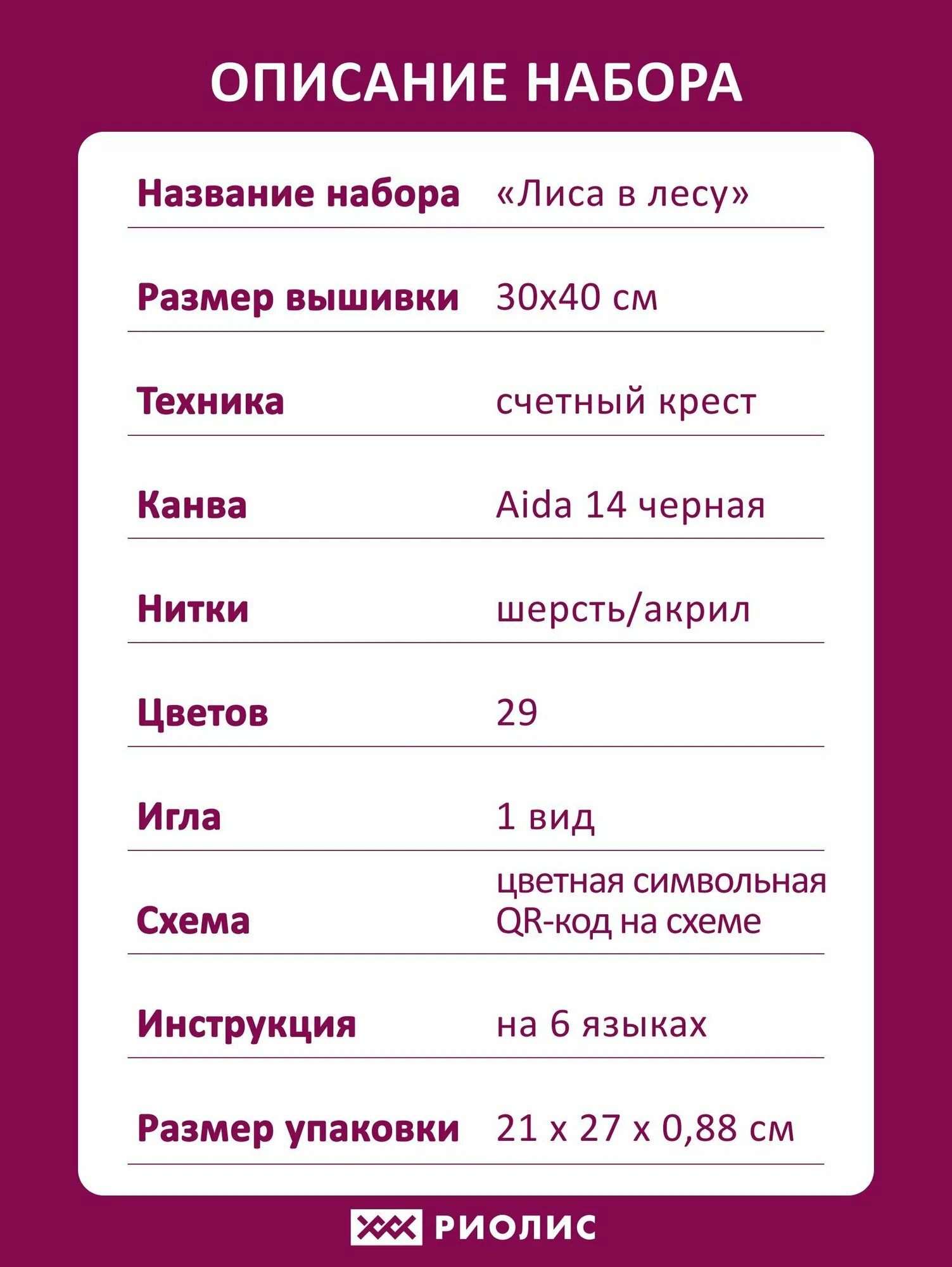 Набор для вышивания крестом "Лиса в лесу" укомплектован: · Канва чёрная, без рисунка 14 каунта · Нити на плашках шерсть / акрил (30% шерсть / 70% акрил) · Количество цветов – 29 оттенков · Размер готовой работы 30 х 40 см · Игла для вышивания · Цветная символьная схема · Электронная схема · Подробная инструкция Вышивка выполняется в техника крест, полукрест, стежок, французский узелок, смешанные цвета. Готовая работа станет изюминкой вашего интерьера и порадует как детей, так и взрослых. Набор подходит для праздничных поводов, таких как Рождество, Новый год! Продукция бренда Риолис - оптимальное решение для тех, кто ищет изделие высокого качества, любит творчество и хочет попробовать себя. Благодаря нашим наборам творчество доступно каждому! Просто выберите дизайн по душе и становитесь его создателем. От маленьких уникальных сюжетов до больших картин и репродукций. Риолис - ваш идеальный выбор!