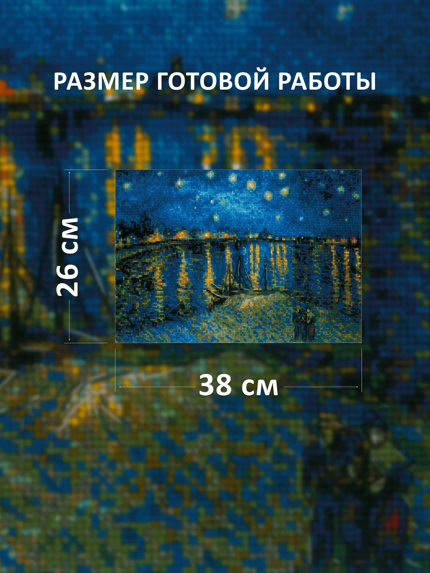 Набор для вышивания крестом "Звёздная ночь над Роной" по мотивам картины Ван Гога укомплектован: · Канва белая, без рисунка 10 каунта · Нити на плашках шерсть / акрил (30% шерсть / 70% акрил) · Количество цветов – 27 оттенков · Размер готовой работы 38*26 см. · Игла для вышивания · Цветная символьная схема · Подробная инструкция Вышивка выполняется в технике стежок, полукрест, счётный крест, смешанные цвета. Продукция бренда Риолис - оптимальное решение для тех, кто ищет изделие высокого качества, любит творчество и хочет попробовать себя. Благодаря нашим наборам творчество доступно каждому! Просто выберите дизайн по душе и становитесь его создателем. От маленьких уникальных сюжетов до больших картин и репродукций. Риолис - ваш идеальный выбор!