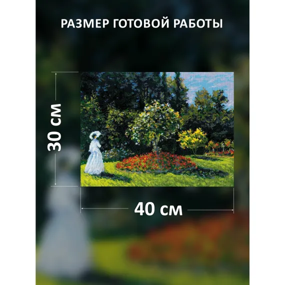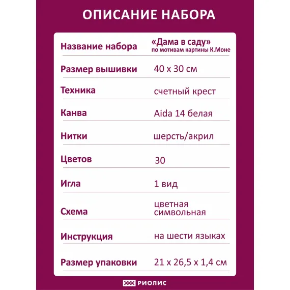 В набор для вышивания "Дама в саду" входит канва беля 14 каунта, нити шерсть/акрил на плашках 30 оттенков, игла, цветная символьная схема. Размер готовой работы 40*30 см. Полная зашивка. В картине отражена излюбленная тема автора — тема природы, а частью как всегда неповторимого пейзажа является утонченная женская фигурка в белом одеянии. Звонкие и чистые цвета природы позволят удачно украсить жилой интерьер и привнести в него ощущение яркого солнечного дня.