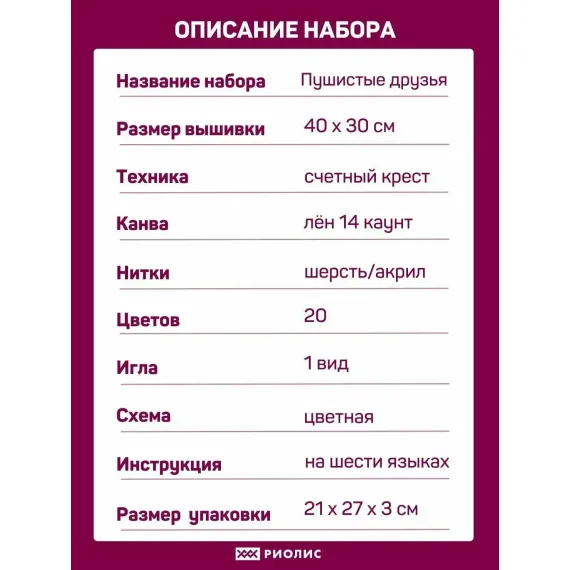 В наборе для вышивания крестом "Пушистые друзья" используются техники: счётный крест, стежок. В наборы Риолис входит все необходимое для творческого процесса. Мы комплектуем наборы с запасом ниток в 20% от необходимого количества каждого цвета. Благодаря нашим наборам творчество доступно каждому! Просто выберите дизайн по душе и становитесь его создателем. Размер готовой работы: 40х30 см. Комплектация: канва для вышивания без нанесённого рисунка 14 хлопок/лен, нитки мулине шерсть/акрил 20 цветов на плашке(ах), понятная цветная символьная схема для вышивания крестом, игла, инструкция.