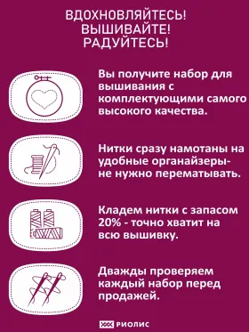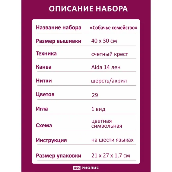 В состав комплекта для вышивания «Собачье семейство» входит канва белая 14 каунта, без нанесённого рисунка, нити шерсть/акрил на плашках 29 оттенков, а также простая для понимания цветная символьная схема и качественная игла для вышивки. Габариты готовой работы 30х40 см. Благодаря подробной схеме и приложенной инструкции работа с картиной будет лёгкой и приятной! Набор подходит для праздничных поводов, таких как День рождения, Рождество, Новый год. Оформленная картина послужит прекрасным презентом для любителя собак. Продукция бренда Риолис - оптимальное решение для тех, кто ищет изделие высокого качества, любит творчество и хочет попробовать себя. В нашем ассортименте найдутся варианты на любой вкус, как для опытных искусниц, так и для начинающих вышивальщиц, для детей и взрослых. От маленьких уникальных сюжетов до больших картин и репродукций. Риолис - ваш идеальный выбор!