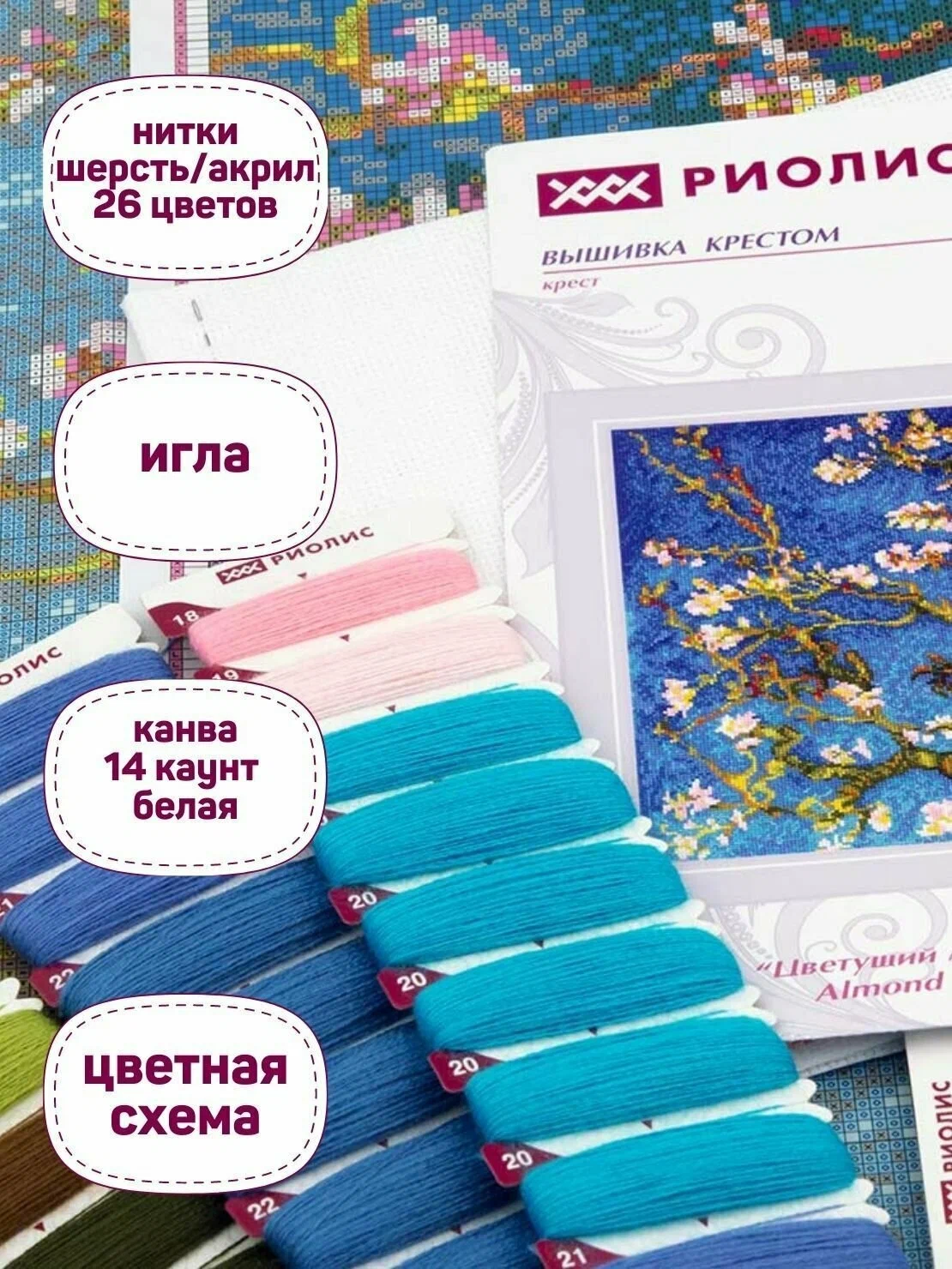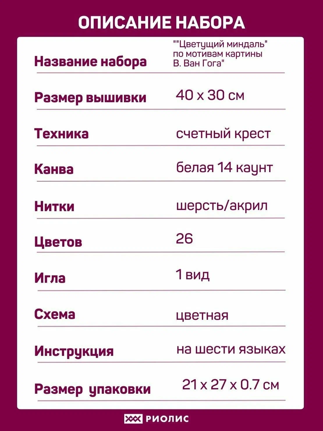 В наборе для вышивания крестом "Цветущий миндаль" по мотивам картины В. Ван Гога" используются техники: счётный крест, смешанные цвета. В наборы Риолис входит все необходимое для творческого процесса. Мы комплектуем наборы с запасом ниток в 20% от необходимого количества каждого цвета. Благодаря нашим наборам творчество доступно каждому! Просто выберите дизайн по душе и становитесь его создателем. Размер готовой работы: 30х40 см. В набор входит: канва для вышивания без нанесенного рисунка 14 белая, нитки мулине шерсть/акрил 26 цветов на плашке(ах), доступная для понимания цветная символьная схема для вышивания крестом, игла, инструкция.