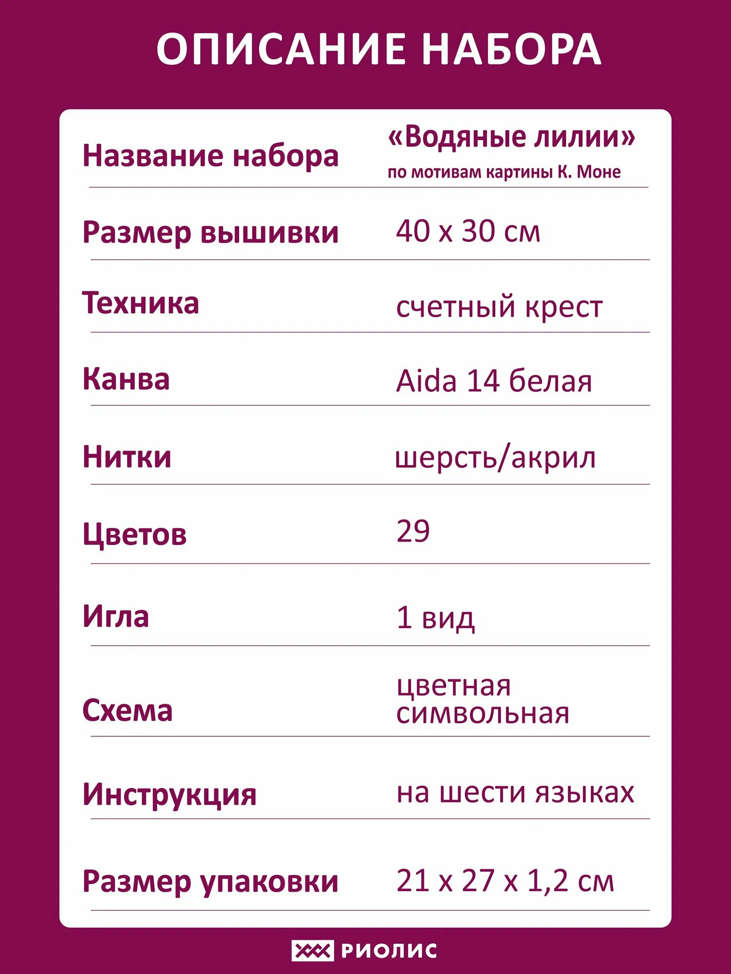 В состав комплекта «Водяные лилии» входит канва белая без нанесённого рисунка 14 каунта, нитки на плашках шерсть / акрил 29 оттенков, а также простая для понимания цветная символьная схема и качественная игла. Габариты готовой работы 40х30 см. Используется техника счетный крест, полукрест, стежок. Прилагается игла для вышивания крестиком нужного размера, чтобы обеспечить легкость и точность шитья. Благодаря подробной схеме и приложенной инструкции работа с картиной будет лёгкой и приятной! Набор подходит для праздничных поводов, таких как День рождения, Рождество, Новый год. Оформленная картина послужит прекрасным презентом для мамы или бабушки. Продукция бренда Риолис - оптимальное решение для тех, кто ищет изделие высокого качества, любит творчество и хочет попробовать себя. В нашем ассортименте найдутся варианты на любой вкус, как для опытных искусниц, так и для начинающих вышивальщиц, для детей и взрослых. От маленьких уникальных сюжетов до больших картин и репродукций. Риолис - ваш идеальный выбор!
