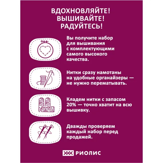Риолис комплектует наборы для рукоделия нитками с запасом в 20% от нужного количества каждого цвета. Благодаря наборам для вышивки творчество доступно каждому! Просто выберите дизайн по душе и становитесь его создателем.