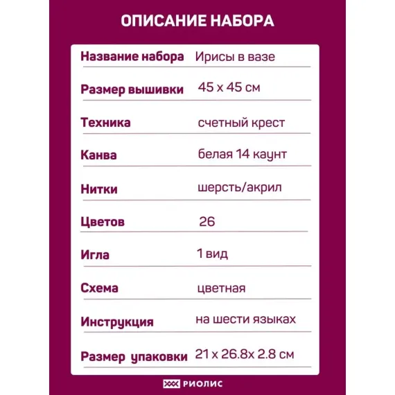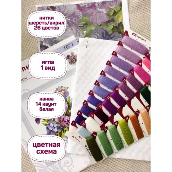 Набор для вышивания крестом Ирисы в вазе 1071 содержит: канва для вышивания без нанесенного рисунка Aida 14 белая, нитки мулине шерсть/акрил 26 цветов на плашке(ах), простая для понимания цветная символьная схема для вышивания крестом, иголка. Готовая работа имеет размер 45х45 см. В наборе используются техники: счётный крест, полукрест.