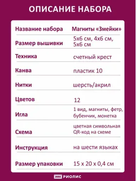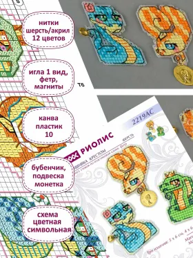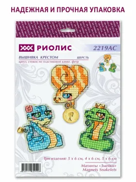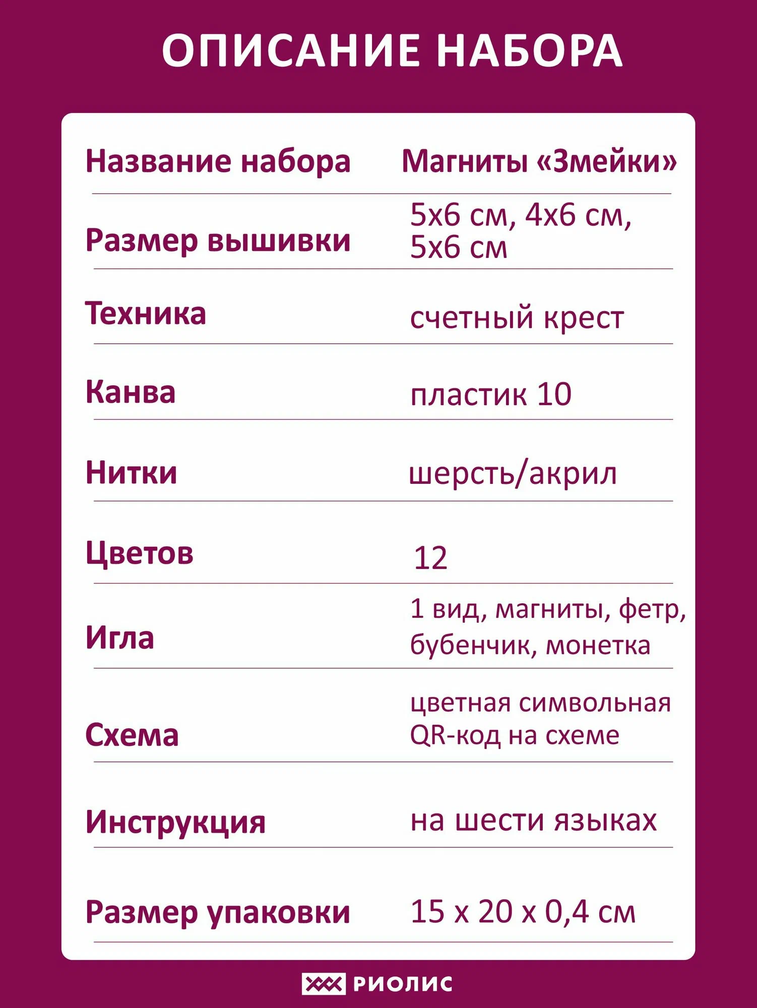 В набор для вышивания магнитов "Змейки" входит: канва пластиковая 10 каунта, нити на плашках шерсть (шерсть 30% / акрил 70%) - 12 оттенков, игла 1 вид, магниты, фетр, бубенчик, монетка, цветная символьная схема, электронная схема. Вышивка выполняется в технике счетный крест, стежок. Готовая работа представляет собой 3 магнита, размерами 6*5, 6*4, 6*5. Продукция бренда Риолис - оптимальное решение для тех, кто ищет изделие высокого качества, любит творчество и хочет попробовать себя. Благодаря нашим наборам творчество доступно каждому! Просто выберите дизайн по душе и становитесь его создателем. От маленьких уникальных сюжетов до больших картин и репродукций. Риолис - ваш идеальный выбор!