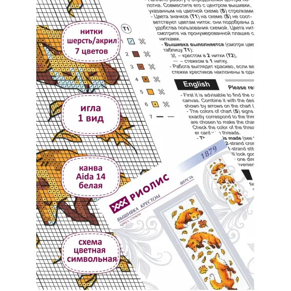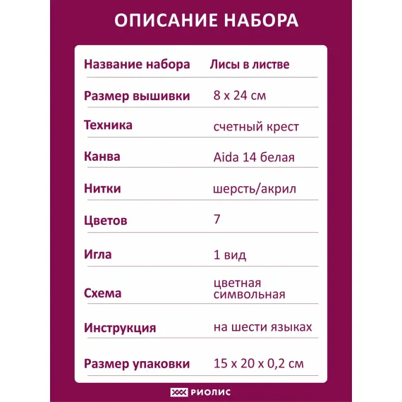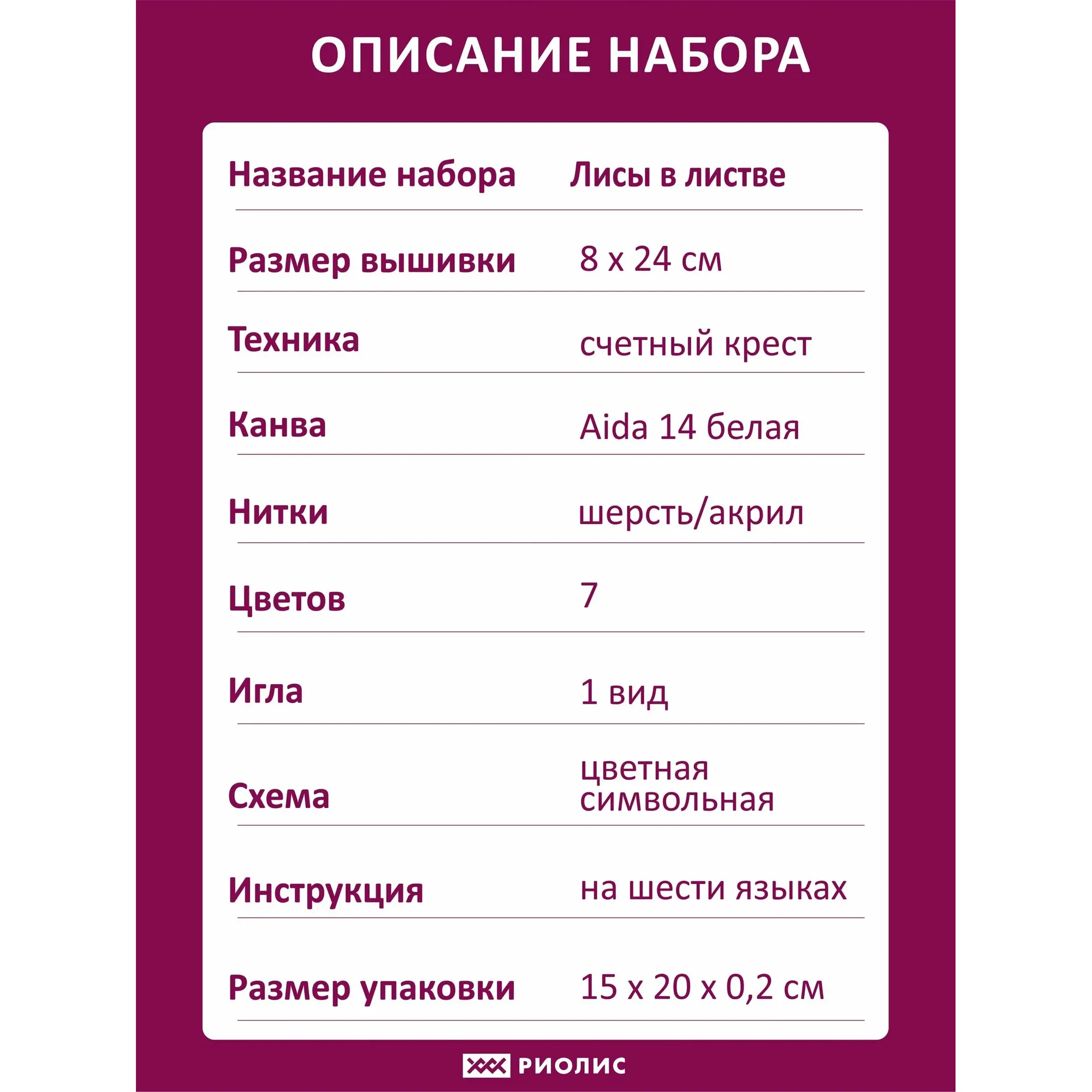В наборе для вышивания крестом "Лисы в листве" используются техники: счётный крест, стежок. В наборы Риолис входит все необходимое для творческого процесса. Мы комплектуем наборы с запасом ниток в 20% от необходимого количества каждого цвета. Благодаря нашим наборам творчество доступно каждому! Просто выберите дизайн по душе и становитесь его создателем. Размер готовой работы: 8х24 см. В набор входит: цветная символьная схема, канва для вышивания без нанесенного рисунка Aida 14 белая, нитки шерсть/акрил (7 цветов) на плашке(ах), игла, инструкция.