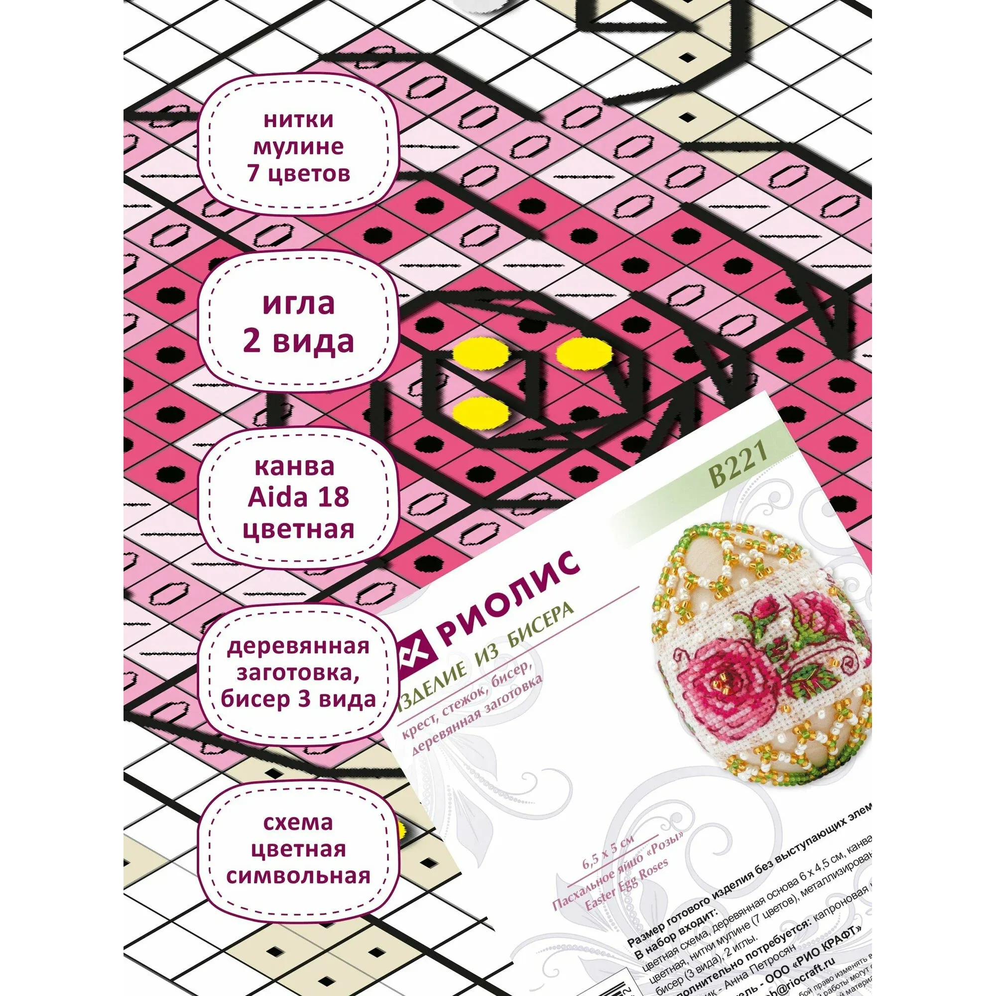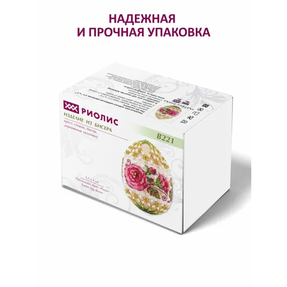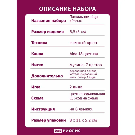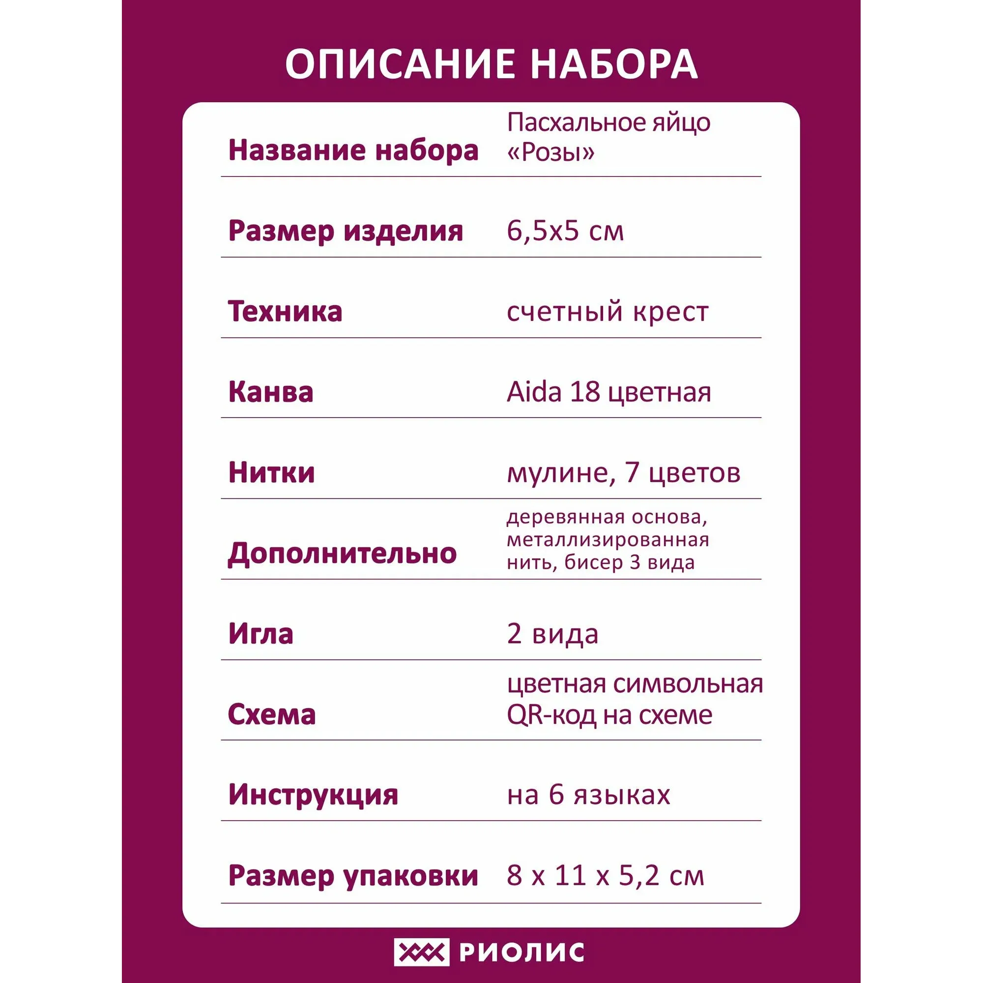 Набор для вышивания пасхального яйца " Розы " укомплектован: · Канва цветная, без рисунка 18 каунта · Нити на плашках мулине - 7 оттенков · Размер готовой работы 6,5 х 5 см. · Деревянная основа 6,5 * 4 см. · Бисер – 3 вида · Игла для вышивания 2 вида · Цветная символьная схема · Подробная инструкция Вышивка выполняется в технике стежок, счётный крест, вышивка бисером. Продукция бренда Риолис - оптимальное решение для тех, кто ищет изделие высокого качества, любит творчество и хочет попробовать себя. Благодаря нашим наборам творчество доступно каждому! Просто выберите дизайн по душе и становитесь его создателем. От маленьких уникальных сюжетов до больших картин и репродукций. Риолис - ваш идеальный выбор!