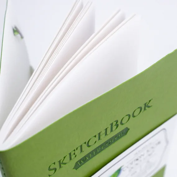 Скетчбуки Малевичъ с профессиональной бумагой для акварели из 100% хлопка плотностью 200 г/м, мелкое зерно. Бумага хорошо смачивается и держит воду, при этом почти не деформируется, высыхает не быстро, позволяет работать по мокрому. На бумаге хорошо получается градиент и растяжка цвета. Во влажном состоянии хорошо вытирается и позволяет внести коррективы. Цвет впитывает не сильно, с учетом, что это хлопок. Скетчбуки в твердом переплете оформлены в обложки имитирующие кожу.