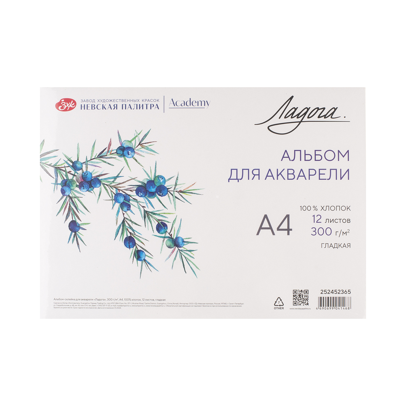 Ладога Альбом-склейка для акварели А4 300гр 12л 100%хлопок гладкая