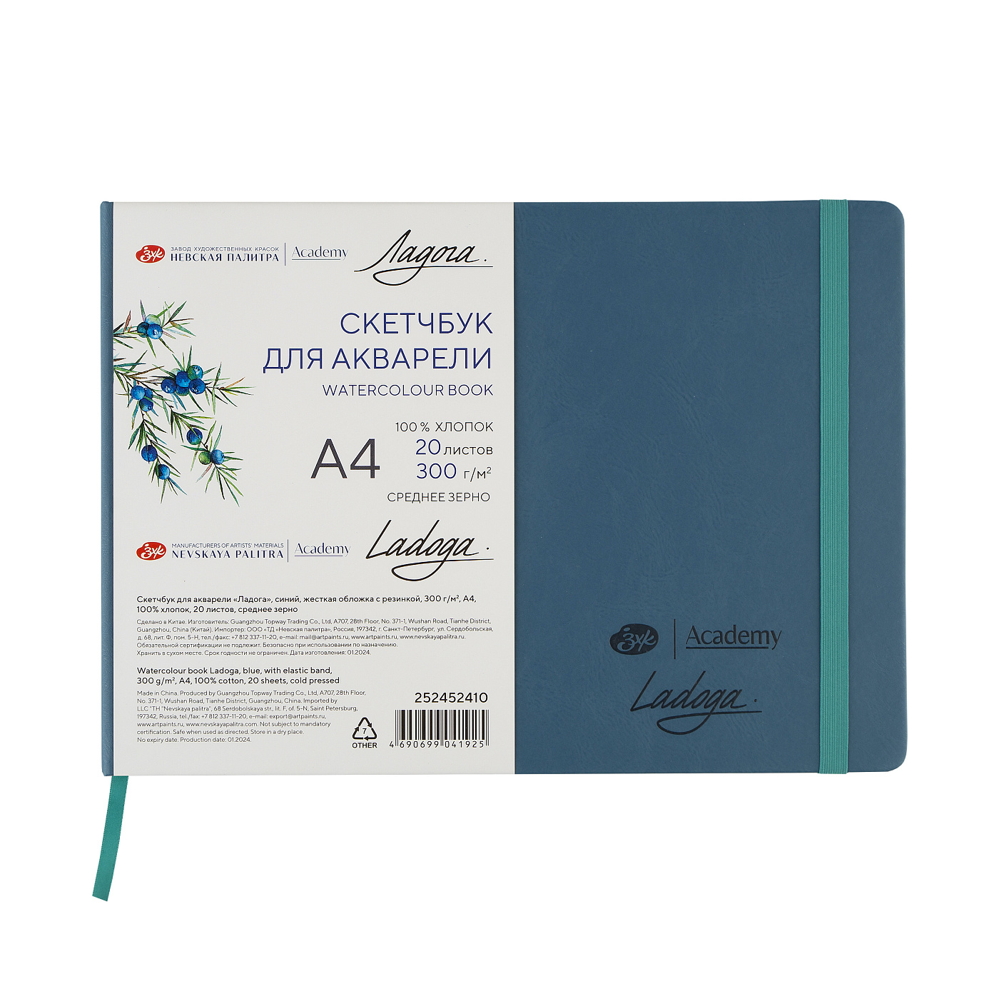 Ладога Скетчбук для акварели А4 20л 300гр с резинкой Синий 100%хл среднее зерно