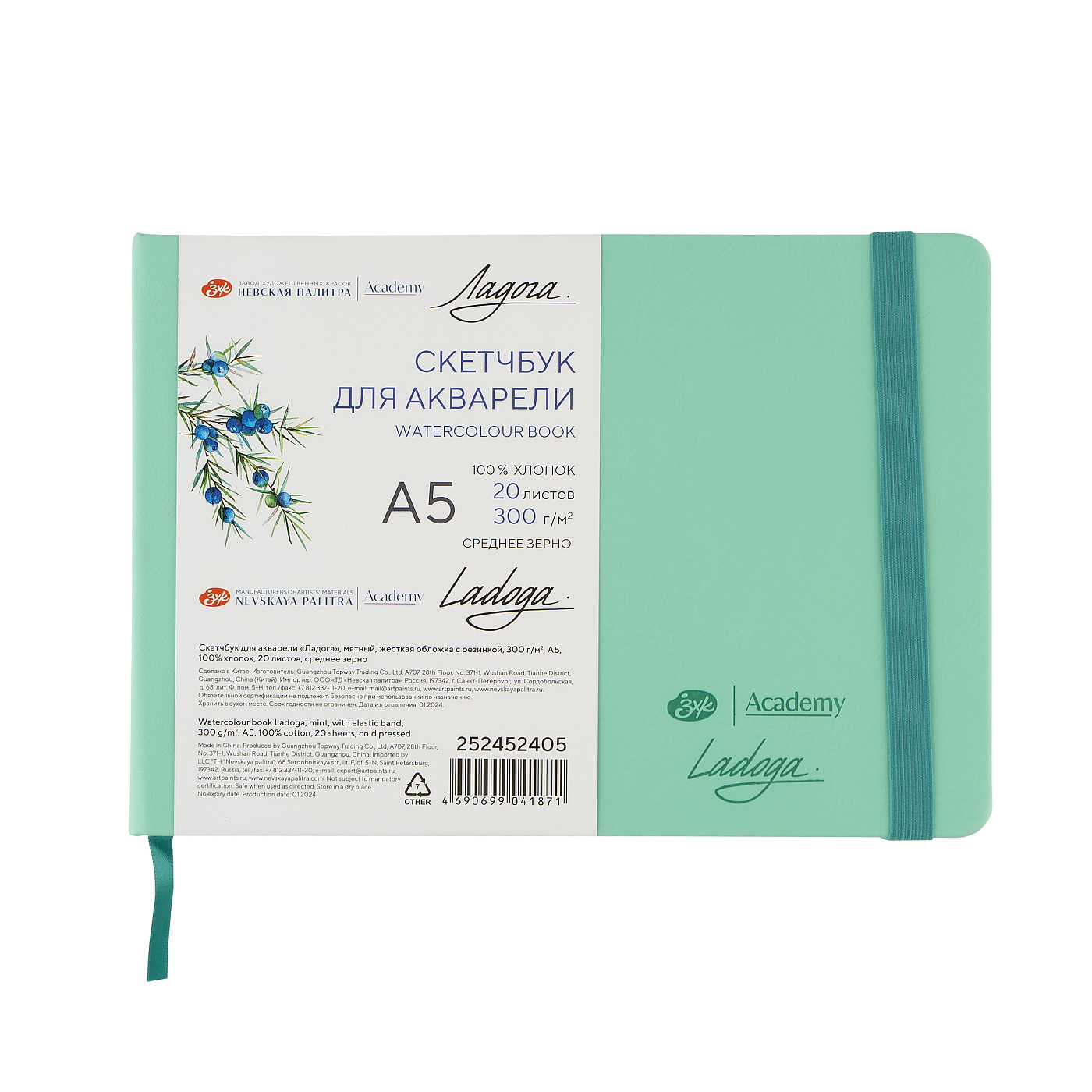 Ладога Скетчбук для акварели А5 20л 300гр с резинкой Мятный 100%хл среднее зерно