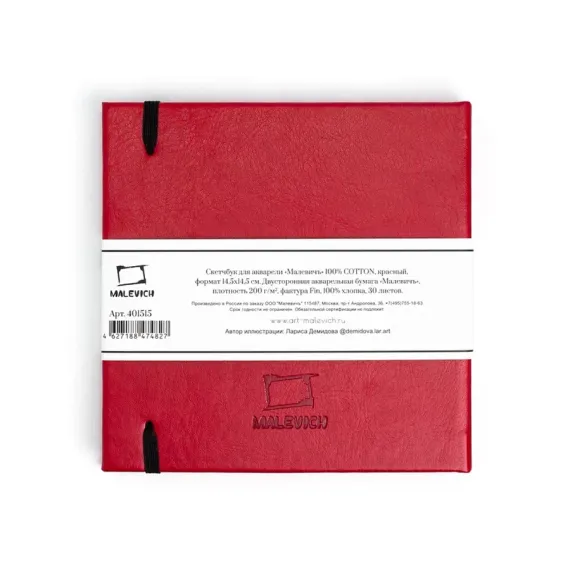 Малевичъ Скетчбук для акварели 100% хлопок 14.5х14.5см 30л 200гр Красный