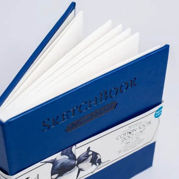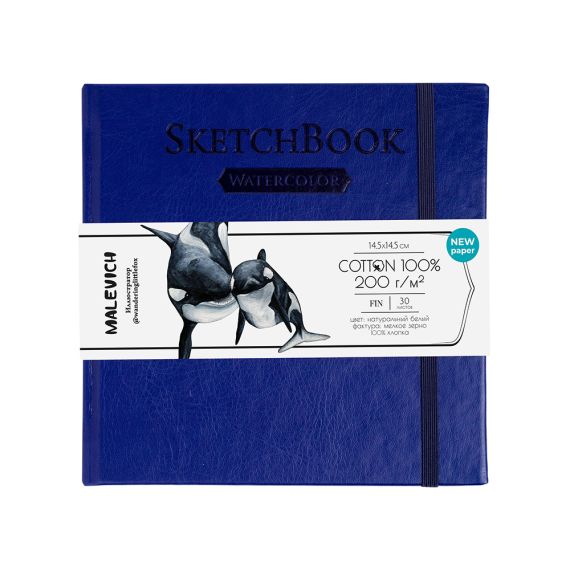 Скетчбуки Малевичъ с профессиональной бумагой для акварели из 100% хлопка плотностью 200 г/м, мелкое зерно. Бумага хорошо смачивается и держит воду, при этом почти не деформируется, высыхает не быстро, позволяет работать по мокрому. На бумаге хорошо получается градиент и растяжка цвета. Во влажном состоянии хорошо вытирается и позволяет внести коррективы. Цвет впитывает не сильно, с учетом, что это хлопок. Скетчбуки в твердом переплете оформлены в обложки имитирующие кожу.
