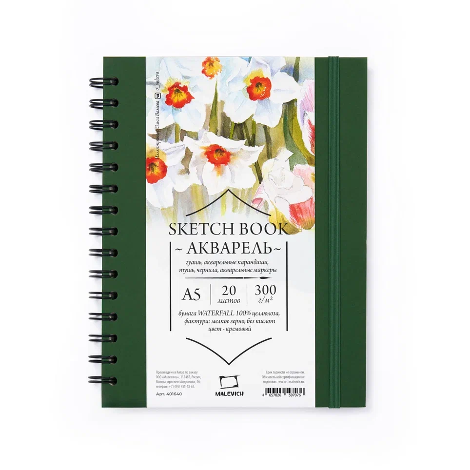 Малевичъ Скетчбук для акварели 15х20см 20л 300гр 100% целлюлоза WaterFall Зеленый