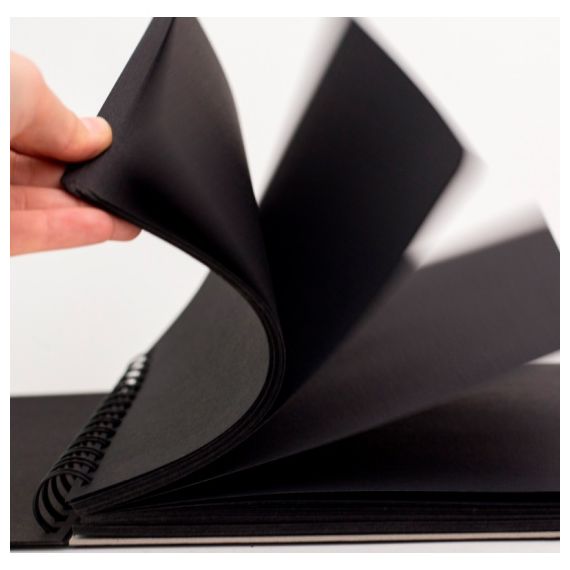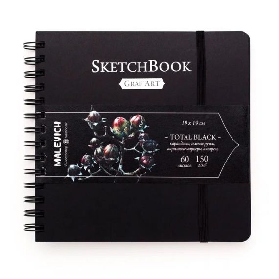 Скетчбук Малевичъ с шероховатой бумагой черного цвета плотностью 150г/м2. Отлично подходит для рисования графическими материалами светлых и ярких тонов, оттенками металлик - карандашами, пастелью, акриловыми маркерами и гелевыми ручками. Листы собраны на спираль. Задняя часть обложки изготовлена из твердого картона, что позволяет использовать скетчбук как планшет и рисовать "на весу".