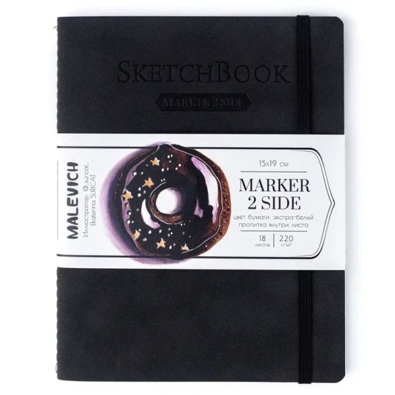Скетчбук Малевичъ для маркеров Markers, индиго, 220 г/м, 15х19 см, 18л. Специализированная серия для рисования спиртовыми маркерами. Бумага имеет специальный слой, который не пропускает чернила на обратную сторону. Благодаря этому слою можно рисовать с обеих сторон бумаги. Скетчбук позволяет рисовать развороты. В блоке 40 листов (80 страниц), плотность бумаги 220 г/м. Скетчбуки в книжном переплете с обложкой имитирующей замшу закрываются на резинку.