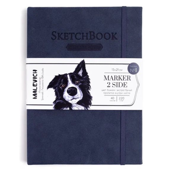 Специализированная серия Малевичъ для рисования спиртовыми маркерами. Бумага имеет специальный слой, который не пропускает чернила на обратную сторону. Благодаря этому слою можно рисовать с обеих сторон бумаги. Скетчбук позволяет рисовать развороты. В блоке 40 листов (80 страниц), плотность бумаги 220 г/м. Скетчбуки в книжном переплете с обложкой имитирующей замшу закрываются на резинку.