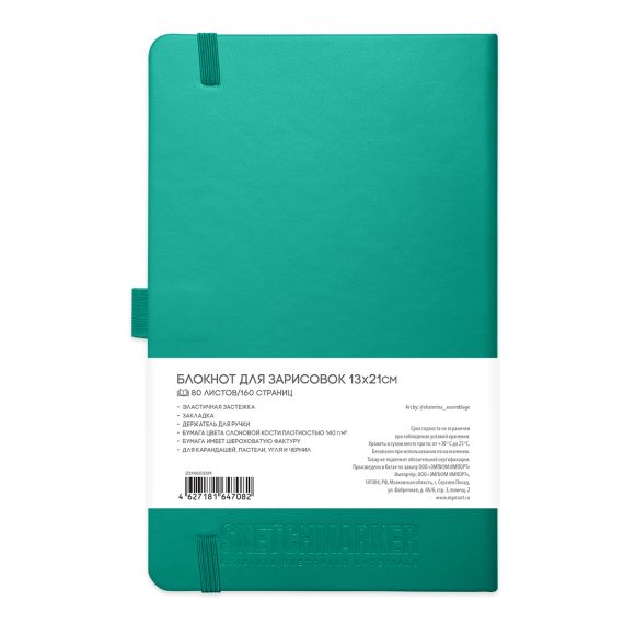 Скетчбук оснащён закладкой-ляссе, эластичной резинкой для фиксации в закрытом виде и держателем для пишущего инструмента. Все эти элементы выполнены в цвете обложки скетчбука.