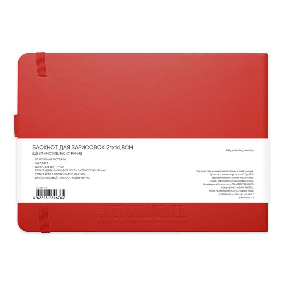 Скетчбук оснащён закладкой-ляссе, эластичной резинкой для фиксации в закрытом виде и держателем для пишущего инструмента. Все эти элементы выполнены в цвете обложки скетчбука.
