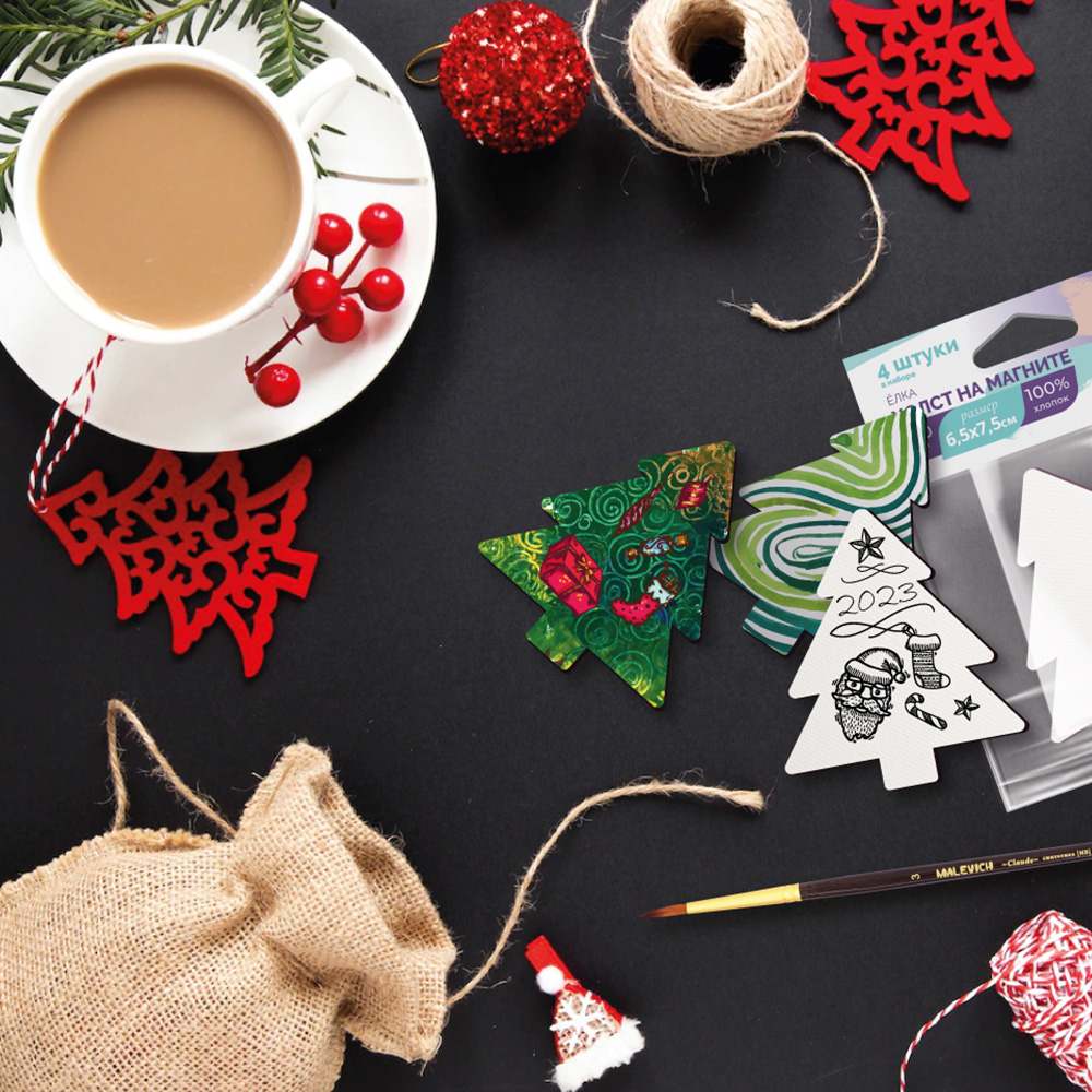 Малевичъ Набор холстов-магнитов 6.5х7.5см 4шт Новогодняя елка