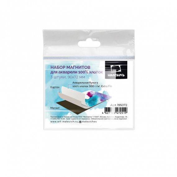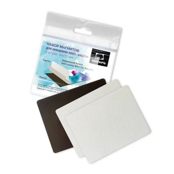 Акварельные магниты — это оригинальный материал для рисования акварелью. Магнит для акварели Малевичъ из 100% хлопка, плотность бумаги 300 гр/м2. Рабочий слой этого материала — бумага для акварели с фактурой экстра-мелкое зерно на картонной подложке, а обратная сторона — магнит, который позволяет использовать готовую работу в качестве подарка или сувенира, или как вспомогательный материал, например, для создания выкрасок и размещения на магнитной доске.