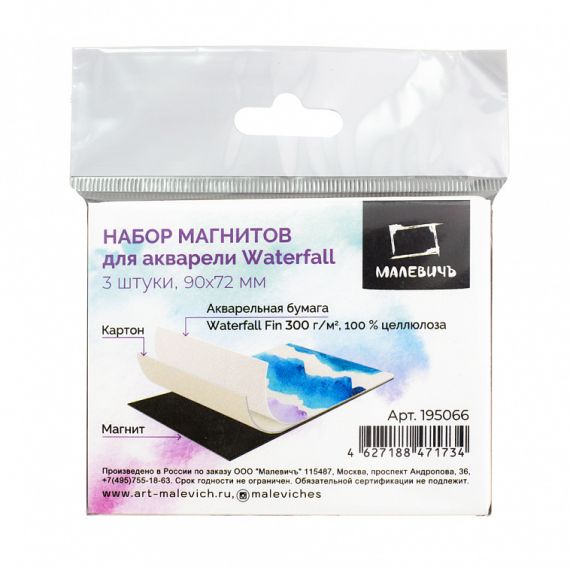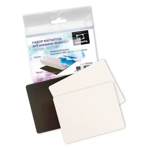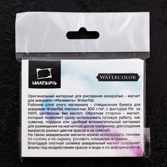 Акварельные магниты — это оригинальный материал для рисования акварелью. Магнит для акварели Малевичъ 100% целлюлозы WaterFall, плотность бумаги 300 гр/м2. Рабочий слой этого материала — бумага для акварели с фактурой fin на картонной подложке, а обратная сторона — магнит, который позволяет использовать готовую работу в качестве подарка или сувенира, или как вспомогательный материал, например, для создания выкрасок и размещения на магнитной доске.