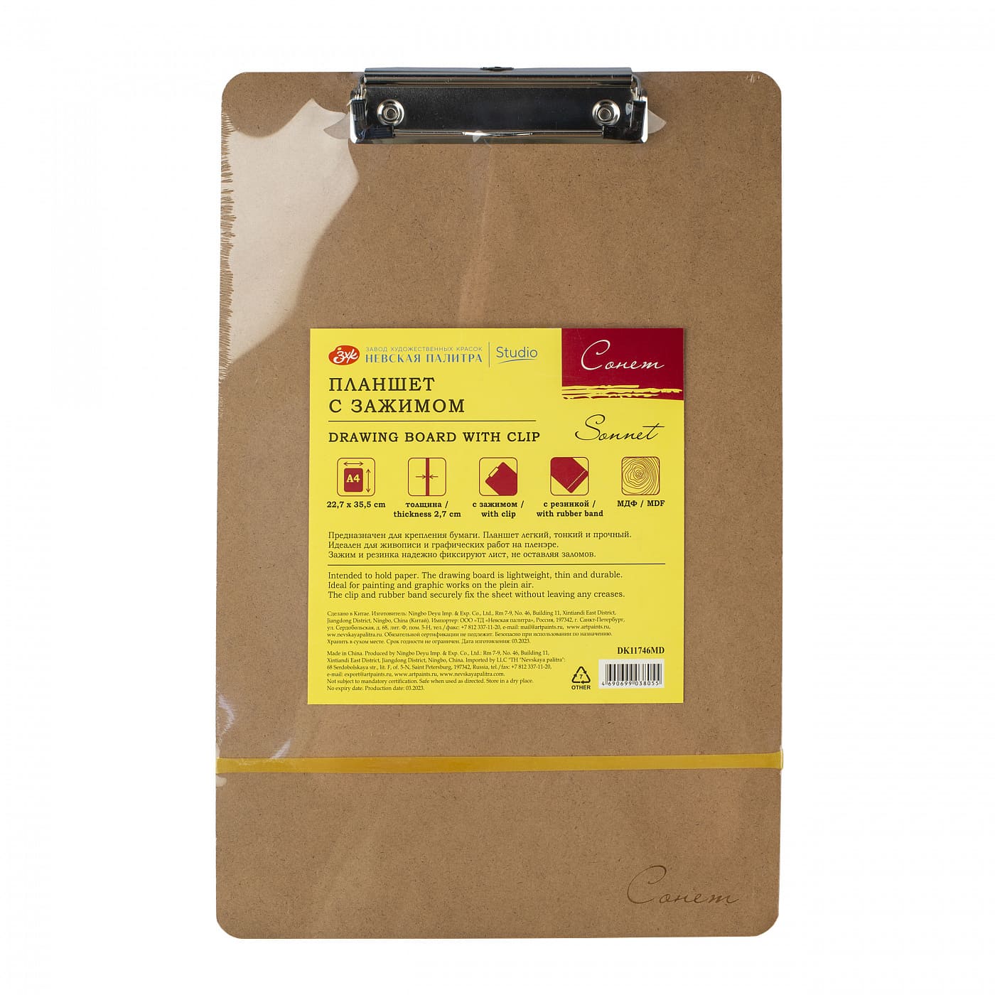 Планшет предназначен для крепления бумаги, для этого предусмотрен специальный металлический зажим. Планшет выполнен из МДФ, обладает малым весом и высокой прочностью. Предназначен для живописных и графических работ, часто используется на пленэрах и вне студии. Зажим и резинка надёжно фиксируют лист бумаги, не оставляя заломов.