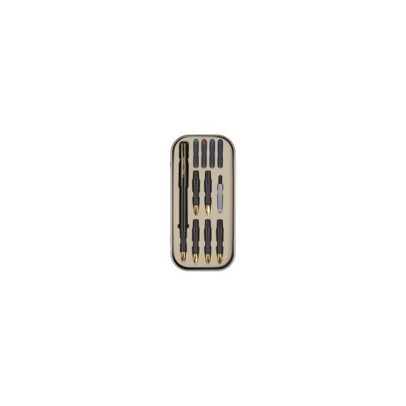Набор для каллиграфии производства голландского концерна Bruynzeel. В состав набора входит всё, что необходимо: - перьевая ручка - 6 сменных наконечников (0.85мм, 1мм, 1.35мм, 1.6 мм, два широких пера) - 4 картриджа с черными чернилами (внутри футляра) – черный, синий, красный, зеленый цвет + 4 колпачка - конвертор -Инструкция включает базовую информацию по начертанию букв, два типа шрифта (латиница).