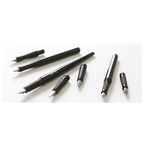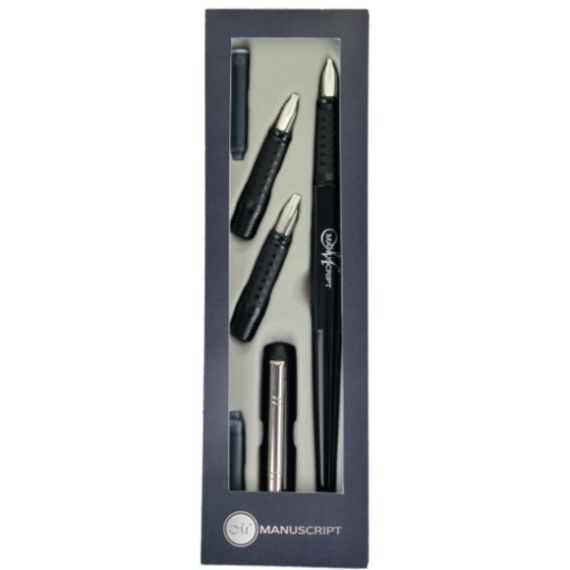 Manuscript Scribe Calligraphy - это комплект с 3 ширококонечными перьями с серебряным покрытием для бесперебойной подачи чернил, 2 черных картриджа и жестяной коробочкой для хранения перьев. Такой набор прекрасно подойдет для повседневного использования начинающих и опытных каллиграфоф.