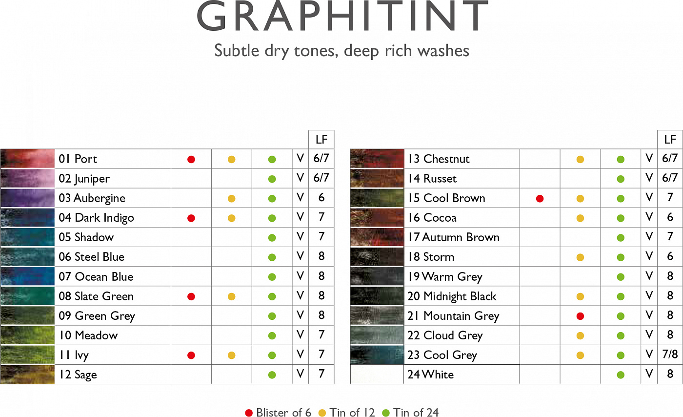Карандаши акварельные GRAPHITINT сочетают в себе лучшие свойства акварельных и графитовых карандашей. В «сухой» технике они создают уникальный эффект: тона серого сочетаются с легким оттенком цвета. При добавлении воды оттенок преобразуется в богатый яркий насыщенный цвет. Все цвета хорошо смешиваются между собой. Карандаши GRAPHITINT можно применять с различными графическими материалами, например, с углём, сангиной и сепией.