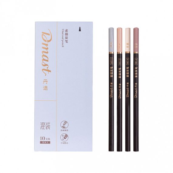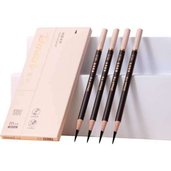 Угольные карандаши Dmast предназначены для набросков и графики. Каждый стержень подвергается обжигу при температуре в 600 °C, чтобы достичь более насыщенного и выраженного эффекта. В наборе 10 карандашей, четырёх видов твердости (2 Hard, 2 Medium, 3 Soft & 3 Super soft)