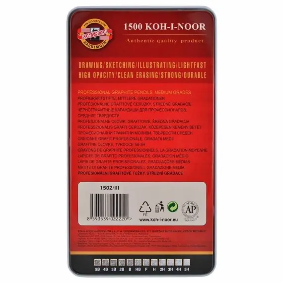 Легендарный «желтый карандаш» является традиционным символом торговой марки Koh-i-Noor. Он широко используется для художественных и дизайнерских работ, графики, технического черчения, в школах и офисах. Набор карандашей средней твердости Koh-i-Noor HARDTMUTH GRAPHIC содержит 12 карандашей в диапазоне от 5B до 5Н, в удобной металлической коробке. Прочный грифель выдерживает хороший нажим, и при этом пишет очень мягко. Не смещается при затачивании. Корпус изготовлен из древесины калифорнийского кедра. Грифель крепится в корпусе при помощи эластичного дисперсионного клея, поэтому он устойчив к деформациям, не крошится и не ломается.