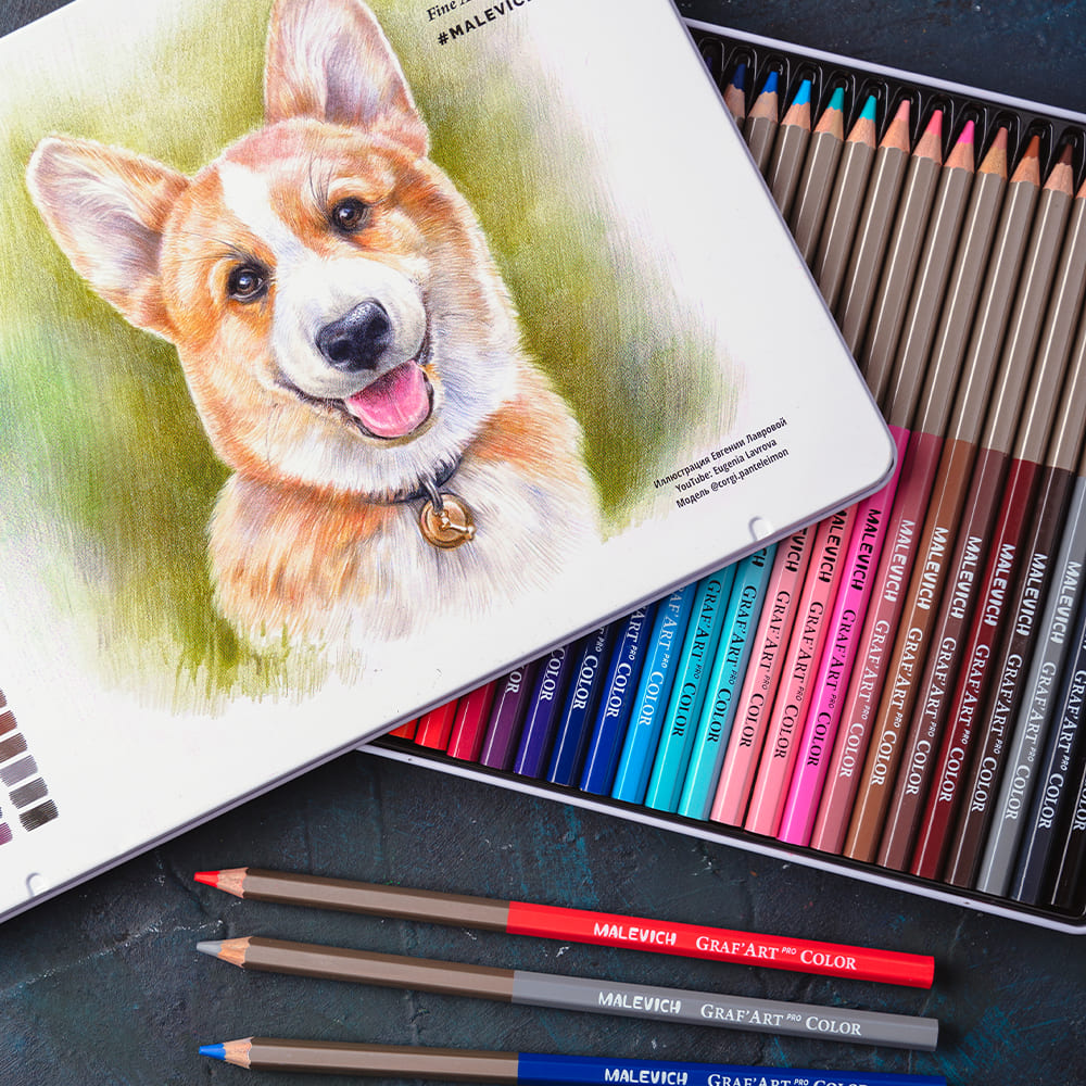 Профессиональные цветные карандаши «Малевичъ» GrafArt PRO на масляной основе средней твердости. Яркие насыщенные пигменты с высокой светостойкостью порадуют любого художника. Карандаши завораживают своей легкостью и свободой в работе не только на белой бумаге, но также на тонированной и даже черной.