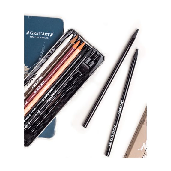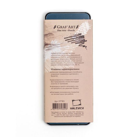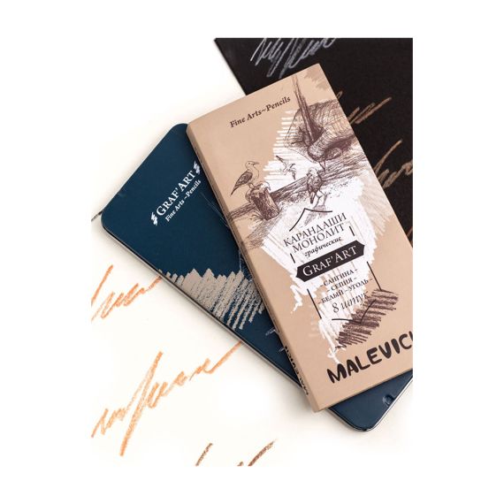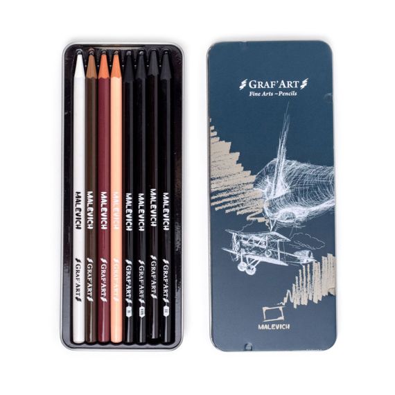 Набор Малевичъ отлично подойдет любителям графического рисунка и портрета. В состав набора входят самые популярные материалы для графики: белый пастельный карандаш, сангина светлая и темная, сепия светлая и темная, угольные карандаши 3 степени жесткости. Карандаши-монолиты, без деревянного корпуса, только грифель. Такие карандаши гораздо удобнее точить и их хватает надолго.
