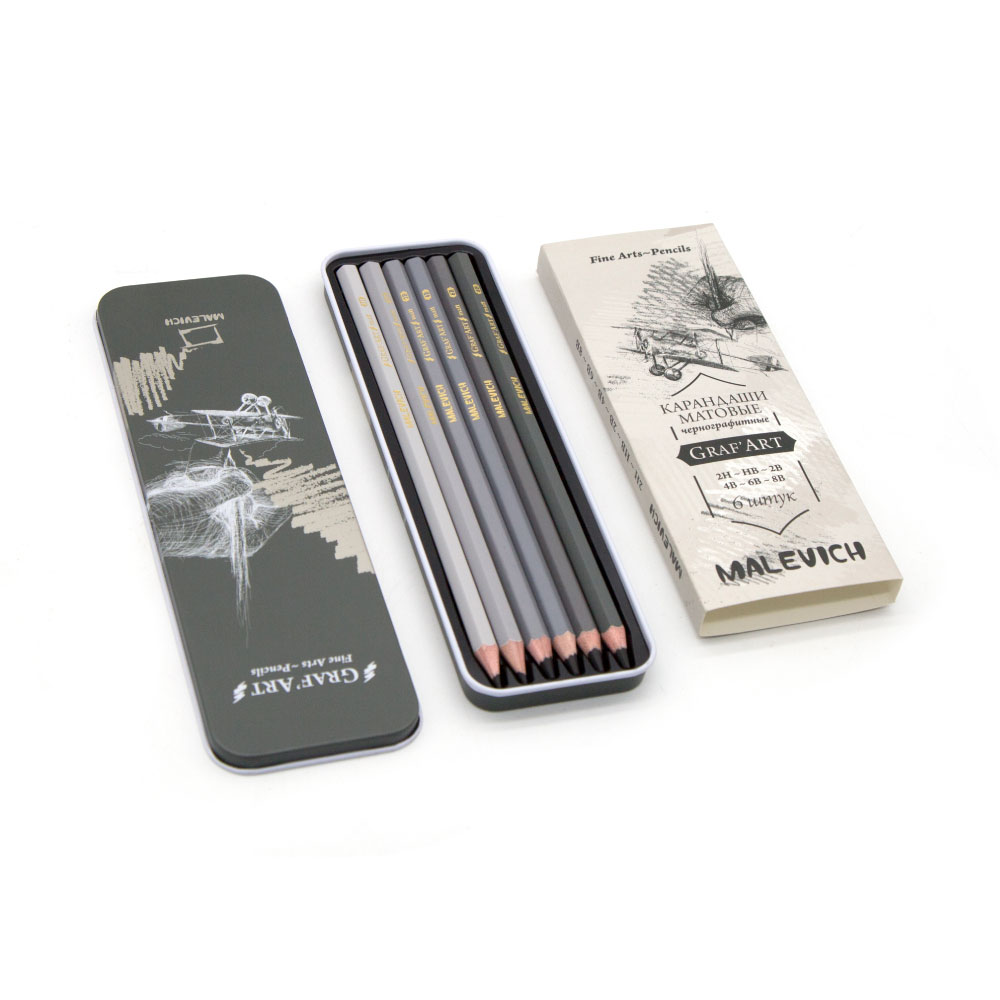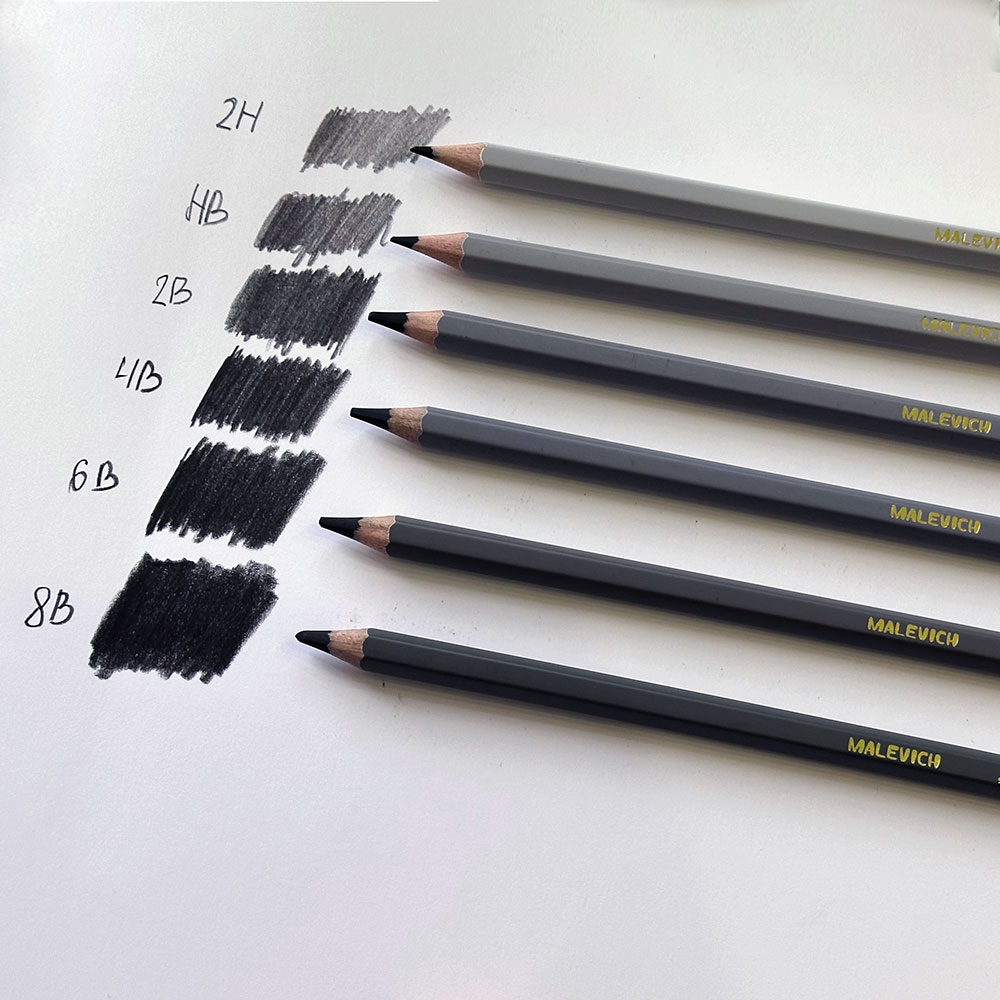 Набор простых карандашей отвечает всем требованиям, предъявляемым к профессиональной художественной продукции. Высококачественный грифель очищен от примесей за счет чего штриховка получается равномерной и четкой. Диаметр грифеля отличается в зависимости от степени мягкости карандаша. Высококачественная древесина обеспечивает лёгкое затачивание, корпус и грифель не крошатся и остаются целыми даже после падения карандаша. Набор матовых карандашей «Малевичъ» включает карандаши разной степени мягкости: 2Н, НВ, 2В, 4В, 6В, 8В. Разнообразие твердости позволяет создавать особую глубину и контрастность работ.