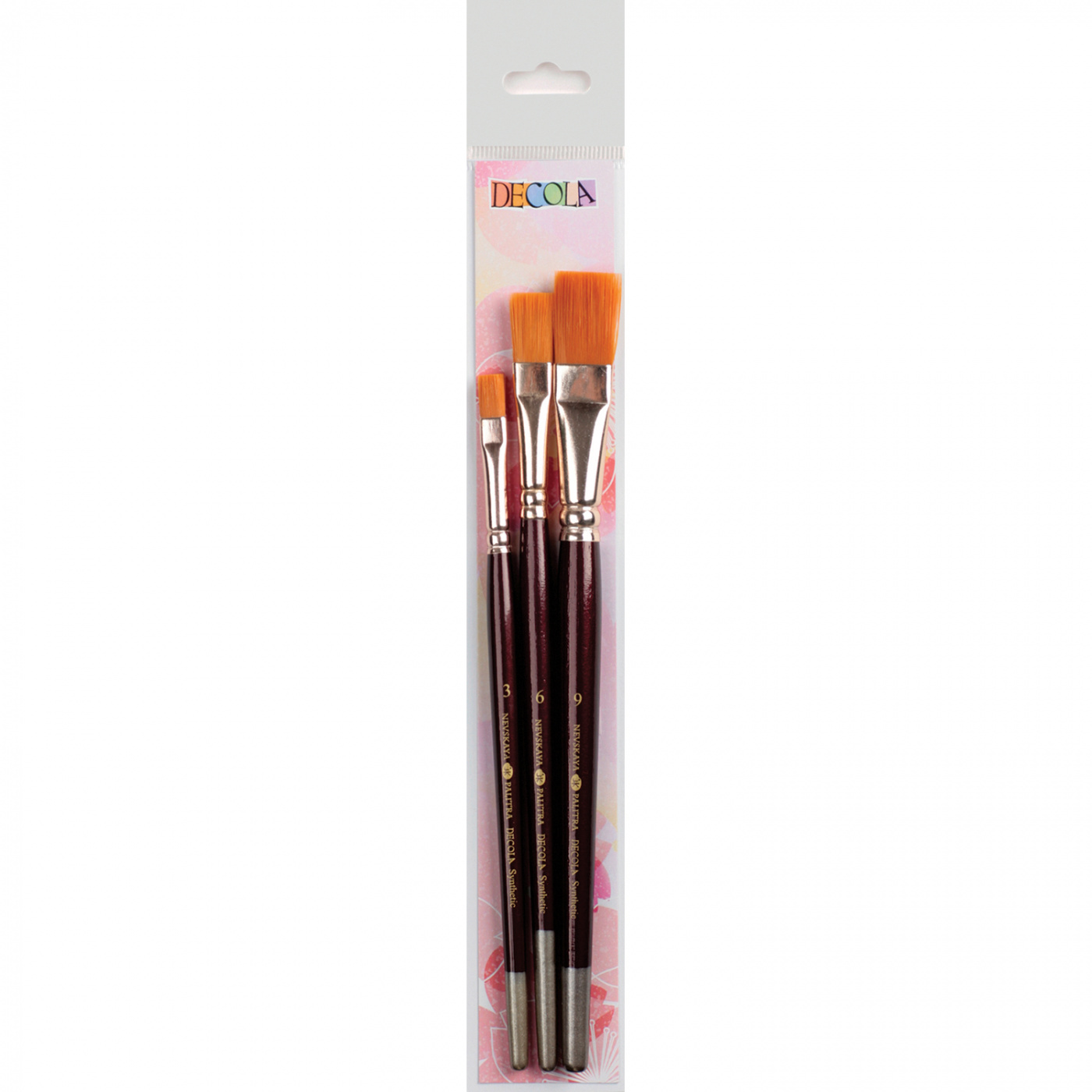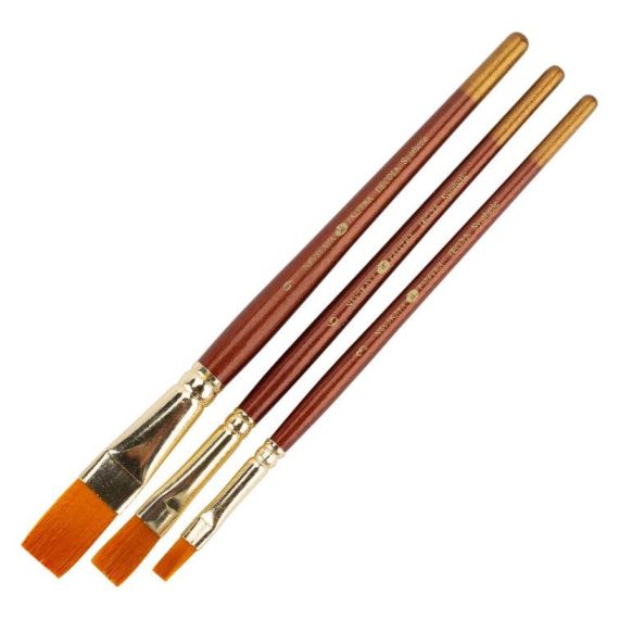 Кисти из качественной синтетики, средней жёсткости, отличаются высокой упругостью и эластичностью, универсальны в использовании – подходят для гуаши, масла и акрила. Средняя жёсткость волоса гарантирует бережное отношение к декорируемой поверхности при использовании в хобби техниках, а густой волос позволяет удерживать большое количество краски или лака. Плоские кисти дают возможность получать более определённую плоскую форму мазка, они удобны для нанесения фона, прорисовки точных очертаний. Также часто используются в хобби техниках – таких как декупаж, роспись по ткани, батик, роспись по керамике и т.д.