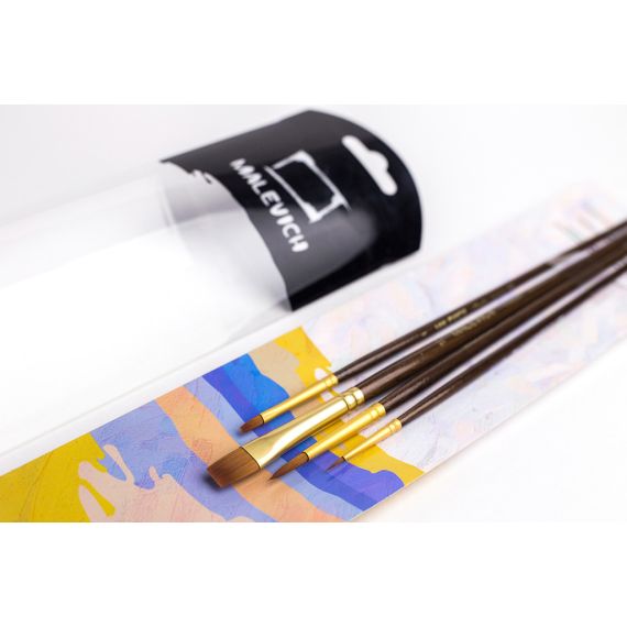 Кисти серии "Claude" ("Клод") от компании "Малевичъ" изготовлены из синтетики золотистого цвета (Shining golden synthetic), имитирующей колонковый волос. Золотистая синтетика это - ворс средней жесткости, который отлично подходит для густых красок: для масла, акрила, гуаши, темперы. Кисти выполнены в благородной цветовой гамме: матовая золотая втулка, коричневый прозрачный лак и лаконичная маркировка делают эти кисти не только надежным художественным инструментом, но и красивым аксессуаром. Кисть держит свою форму даже при частом использовании, ворс прочно закреплен, а втулка не расшатывается со временем.