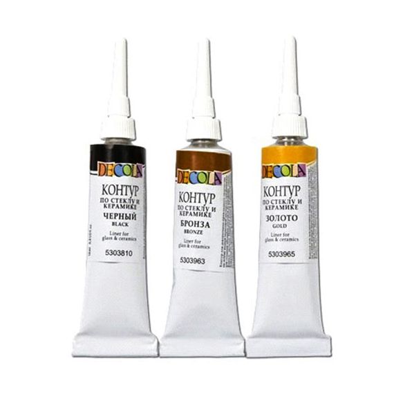 Контуры по стеклу и керамике «Decola» разработаны специально для создания декоративных элементов в росписи стекла и керамики. Контуры удобны при работе с мелкими деталями, также используются для создания четкой границы и не позволяют смешиваться краскам друг с другом.
